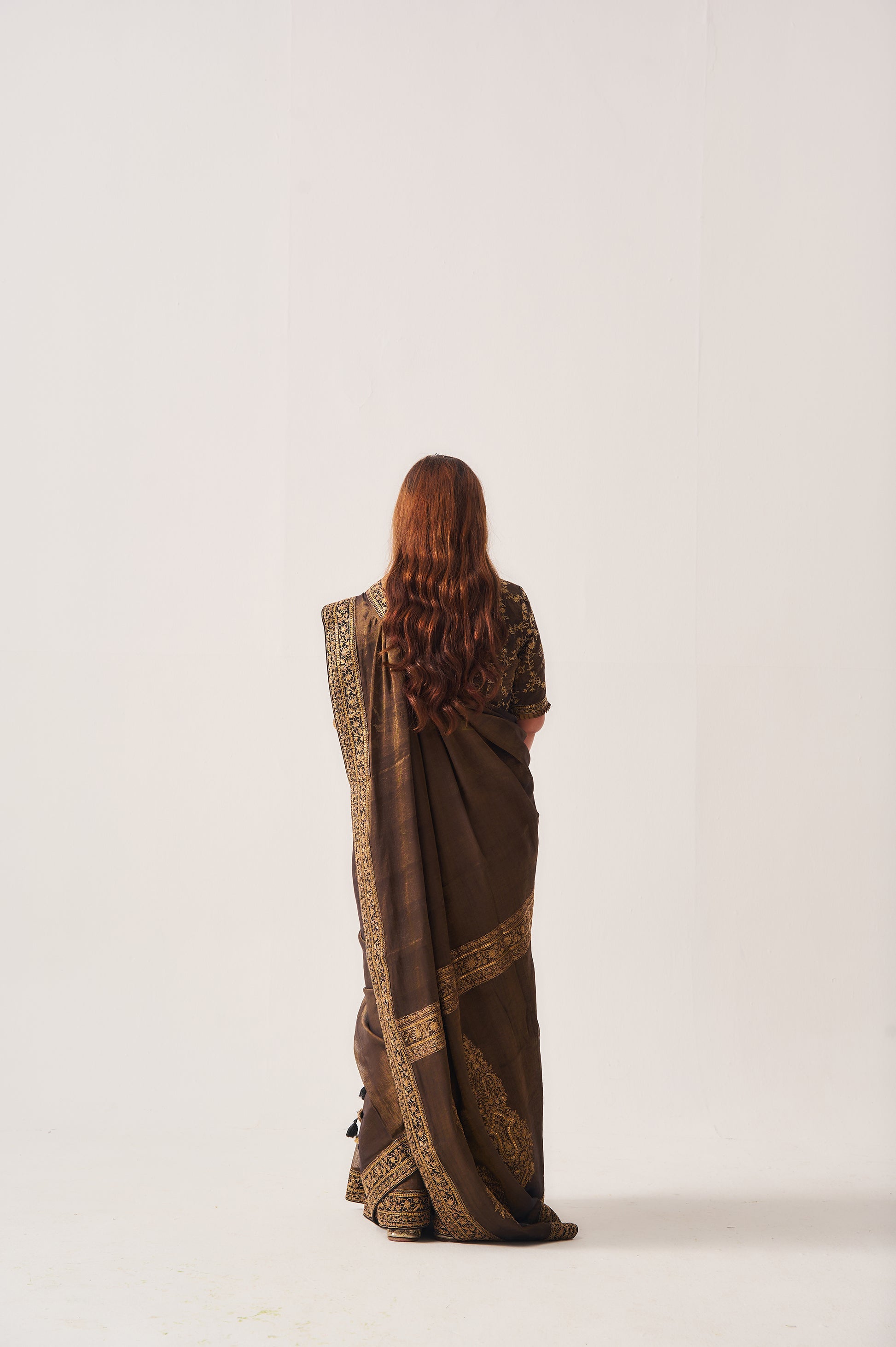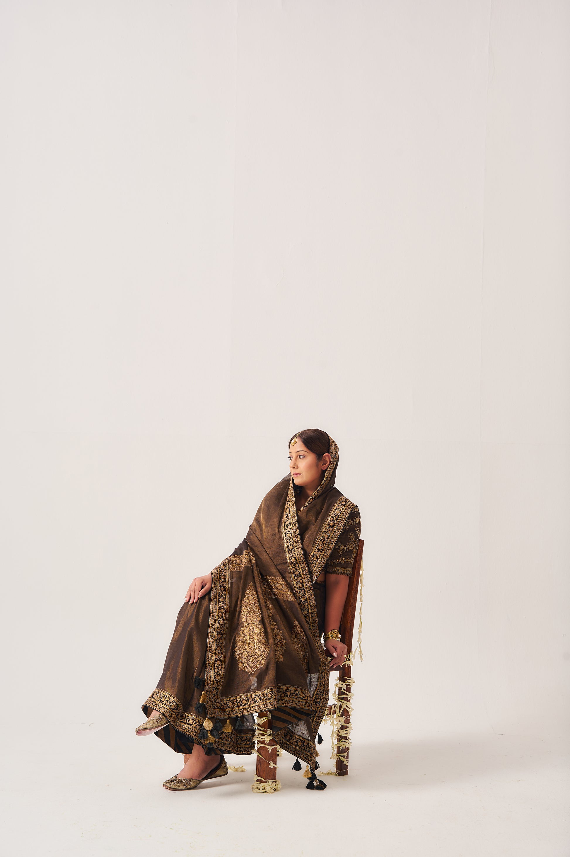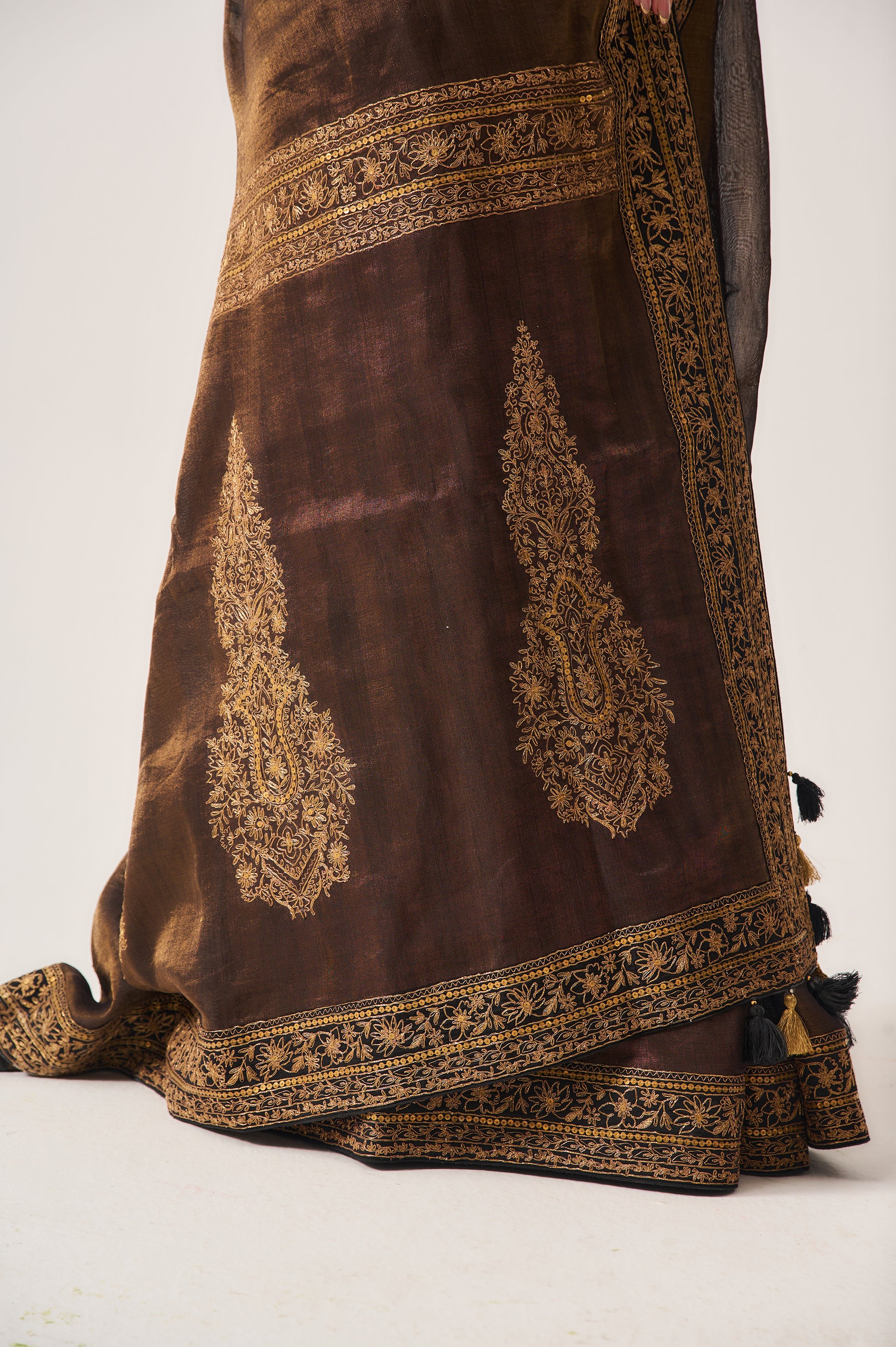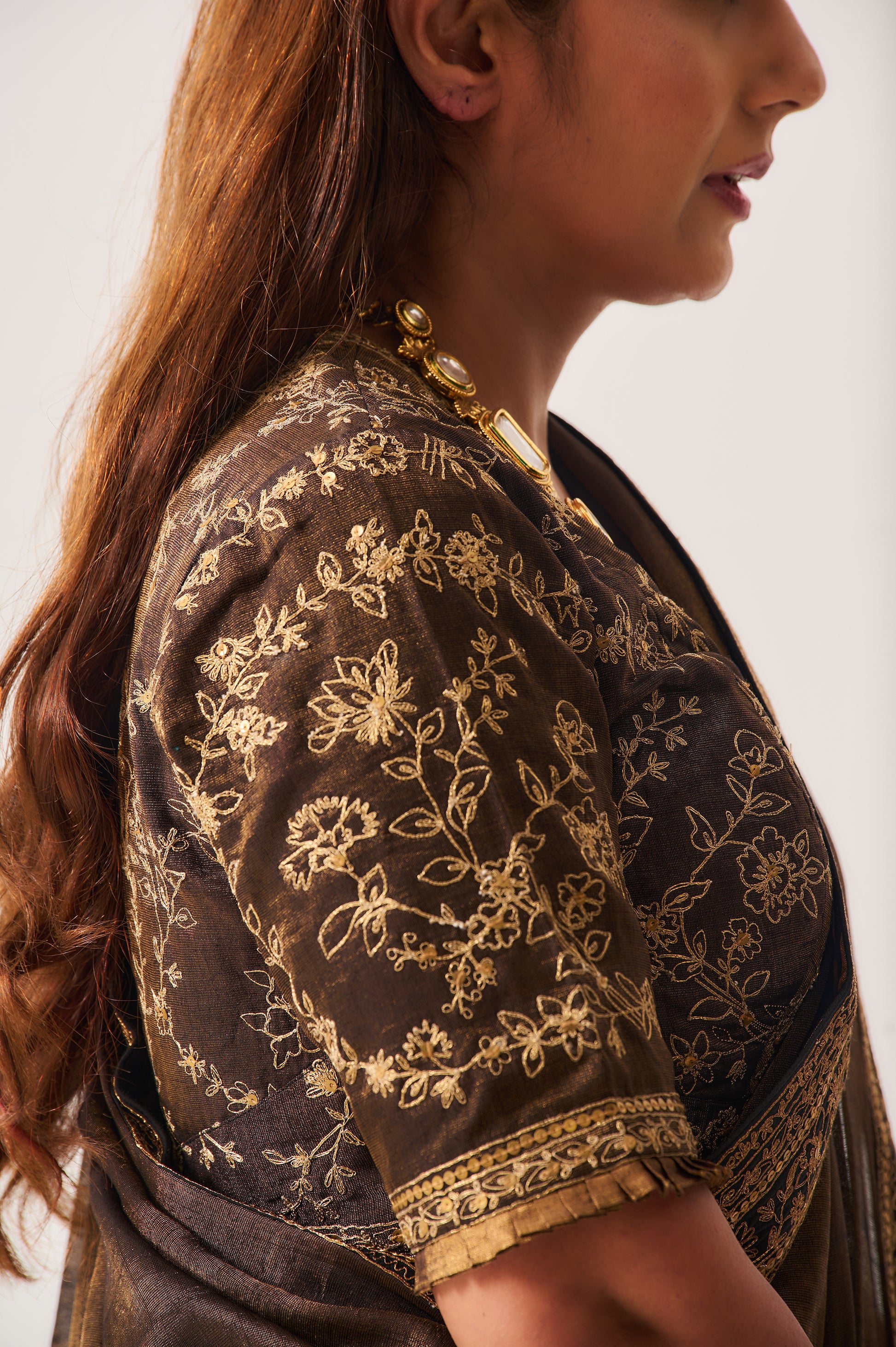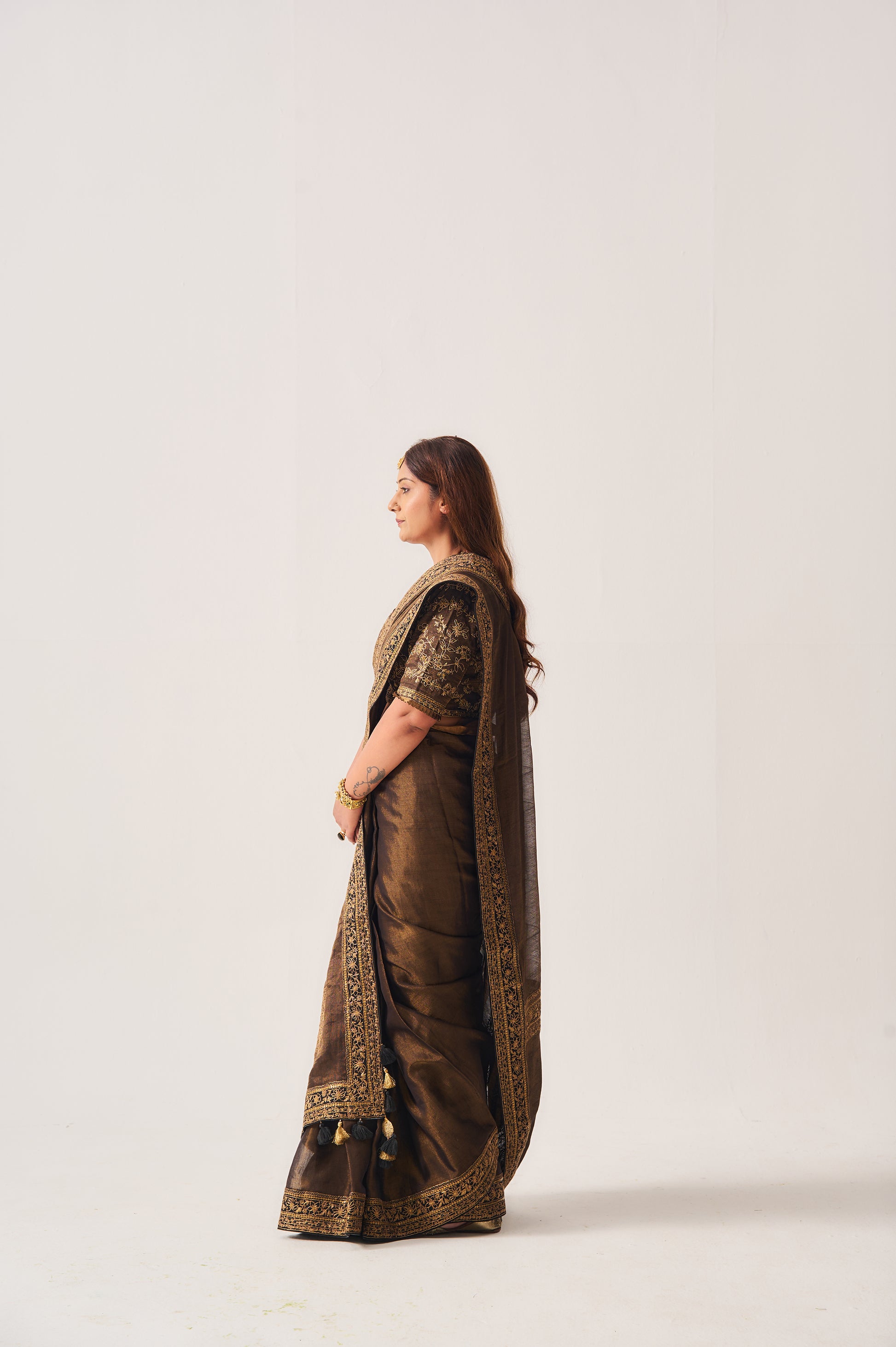 Handwoven Tissue Saree paired with Stitched Blouse. Featuring Intricate Zari Dori and Marodi Embroidery with Hand Highlights of Sequin.