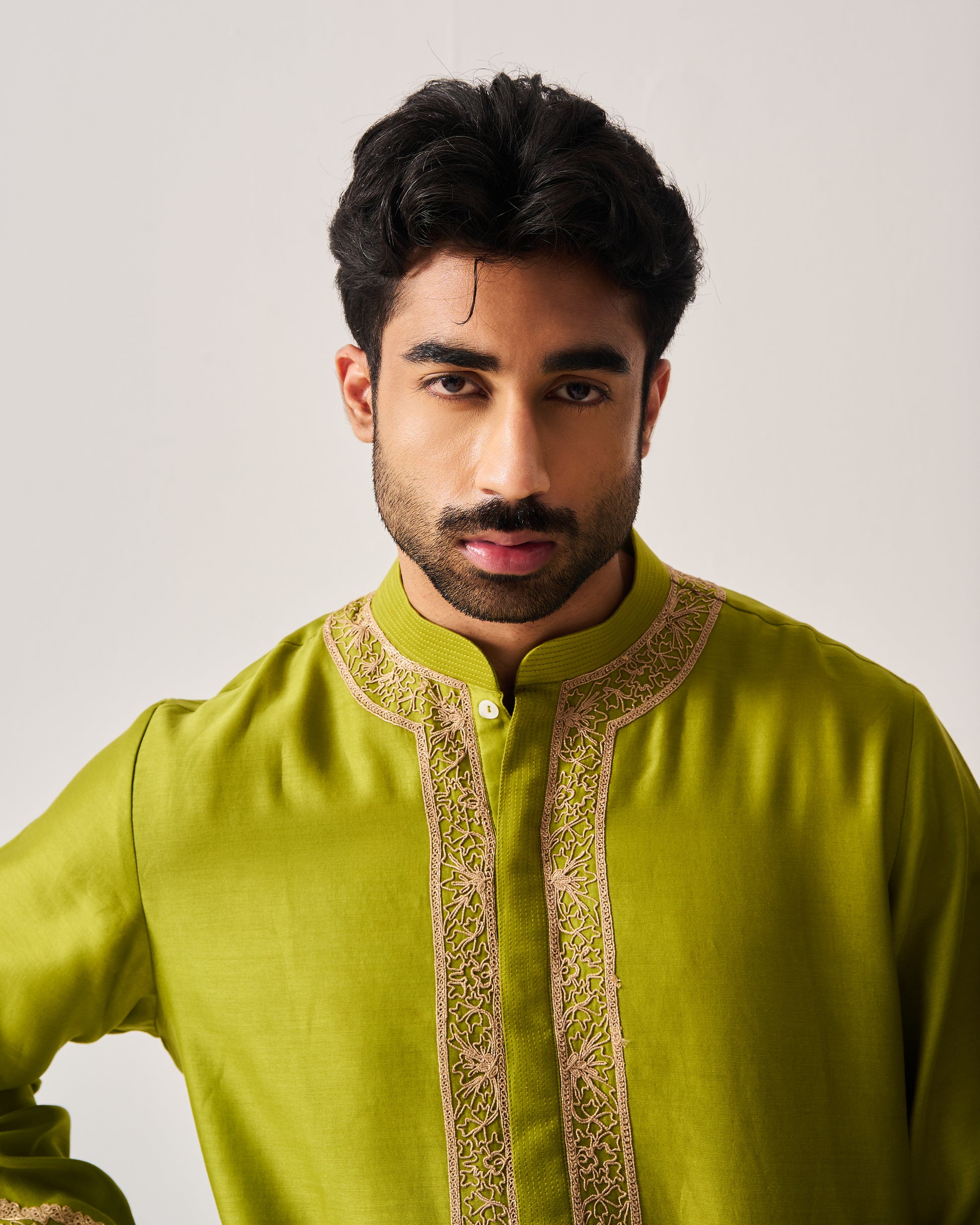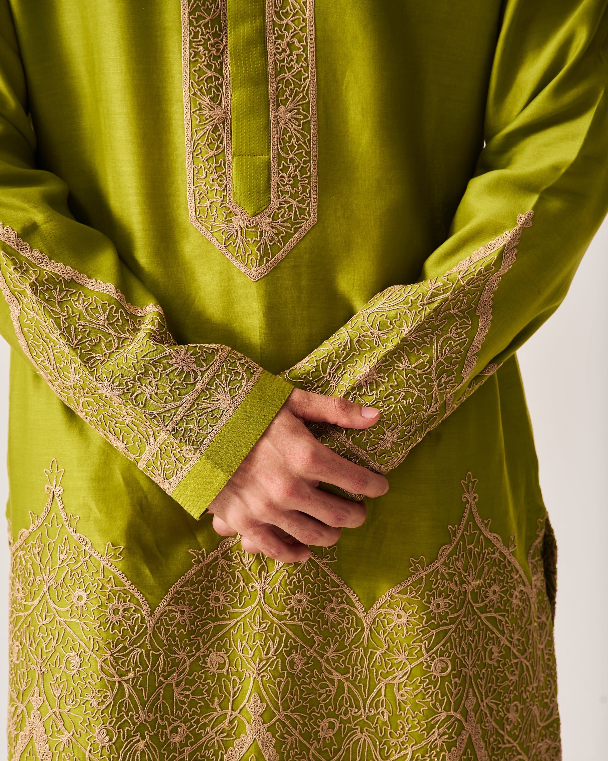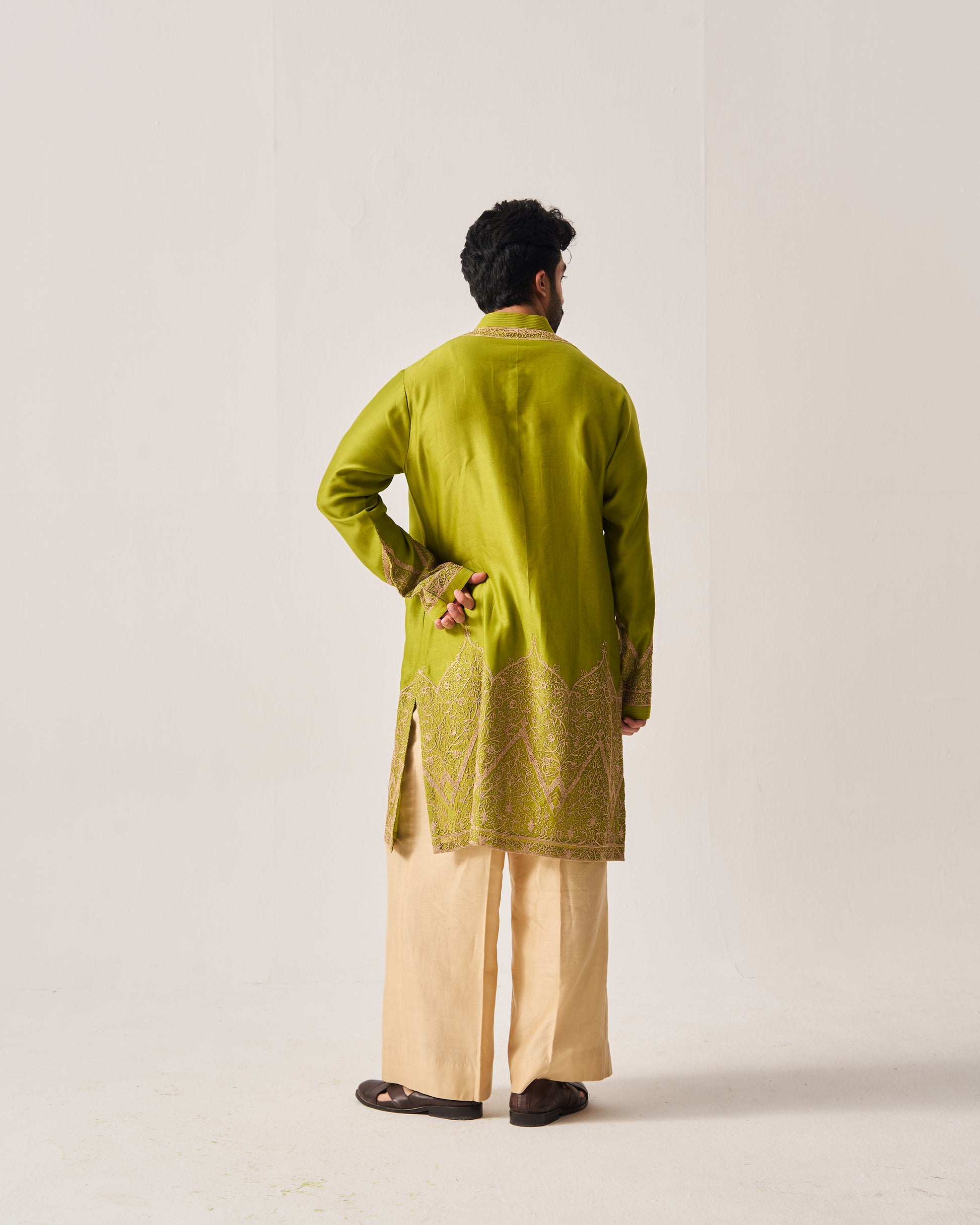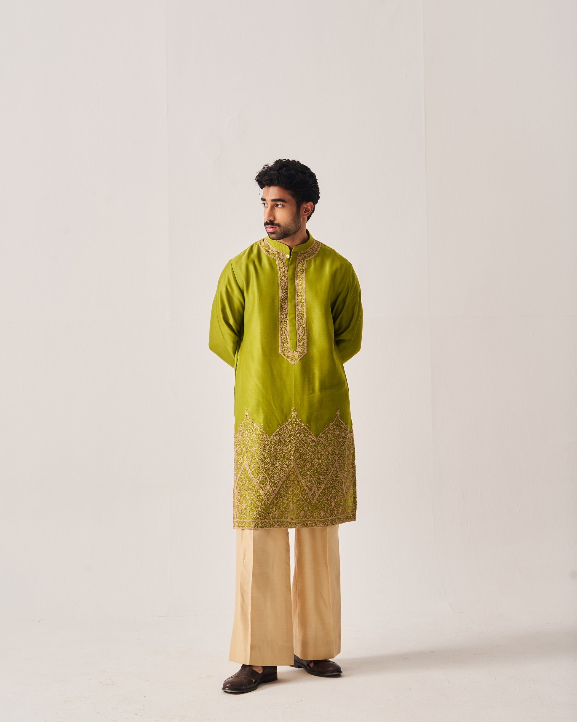 Chanderi Handloom Kurta paired with Flare Pants. Featuring Intricate Zari Dori and Marodi Embroidery.