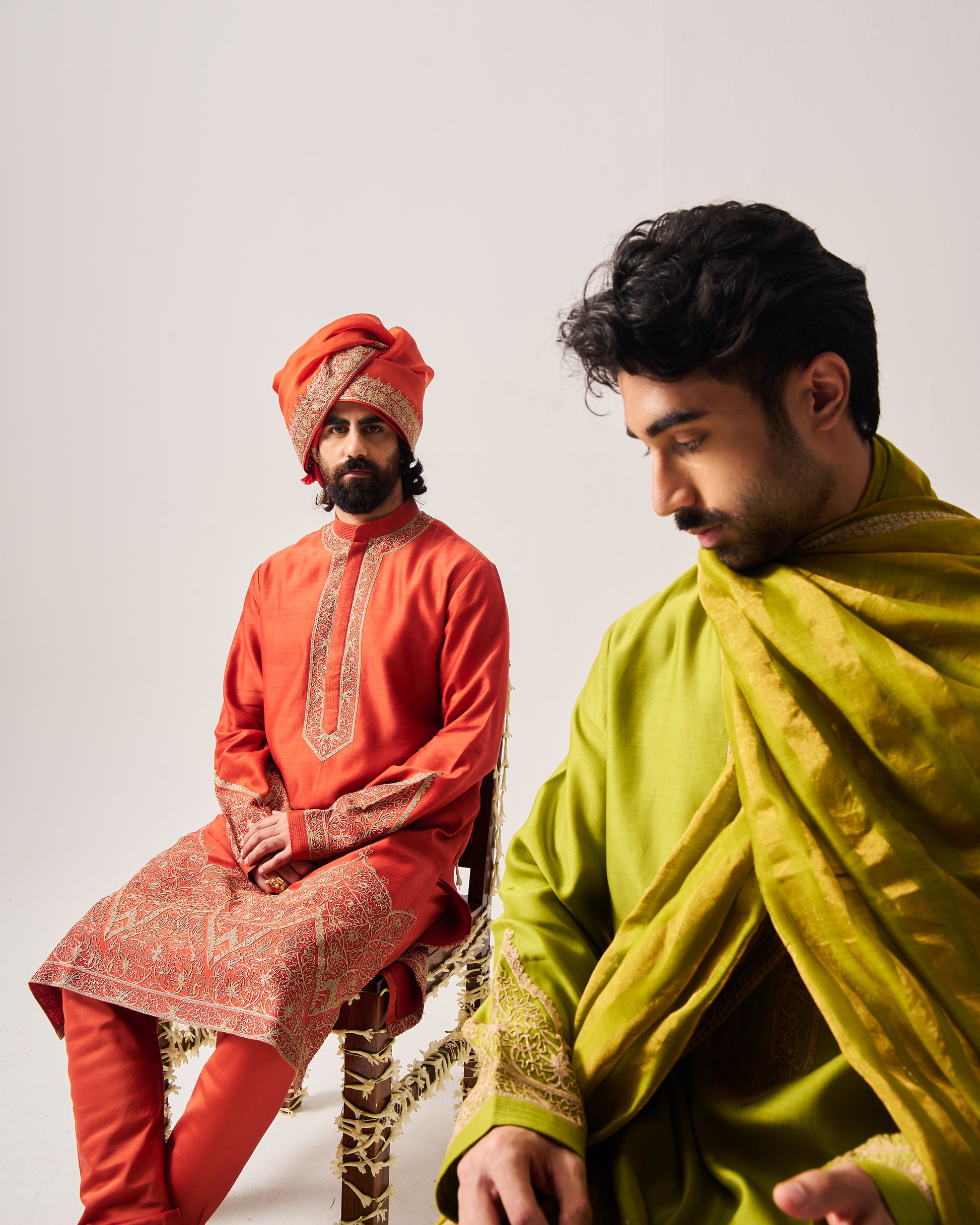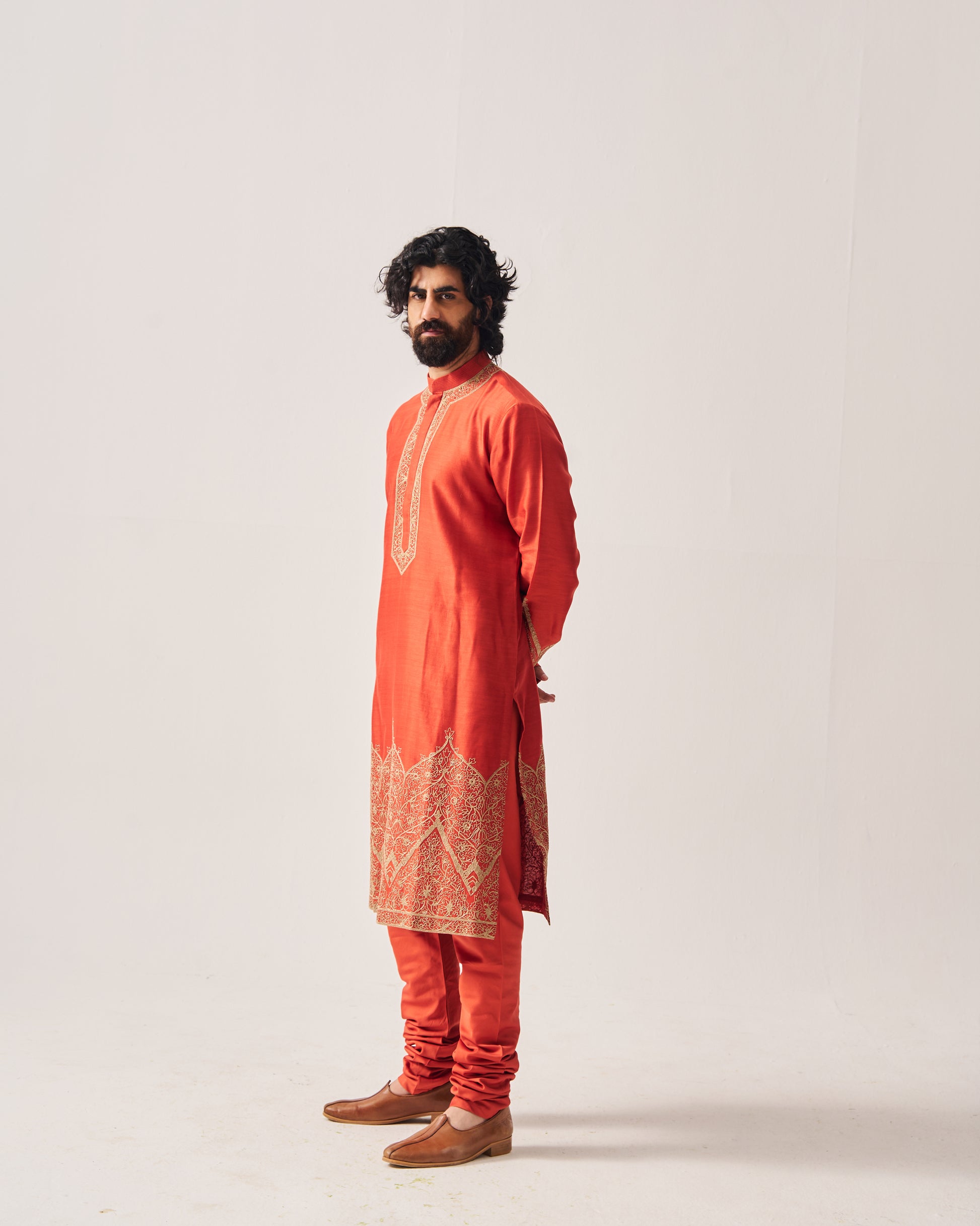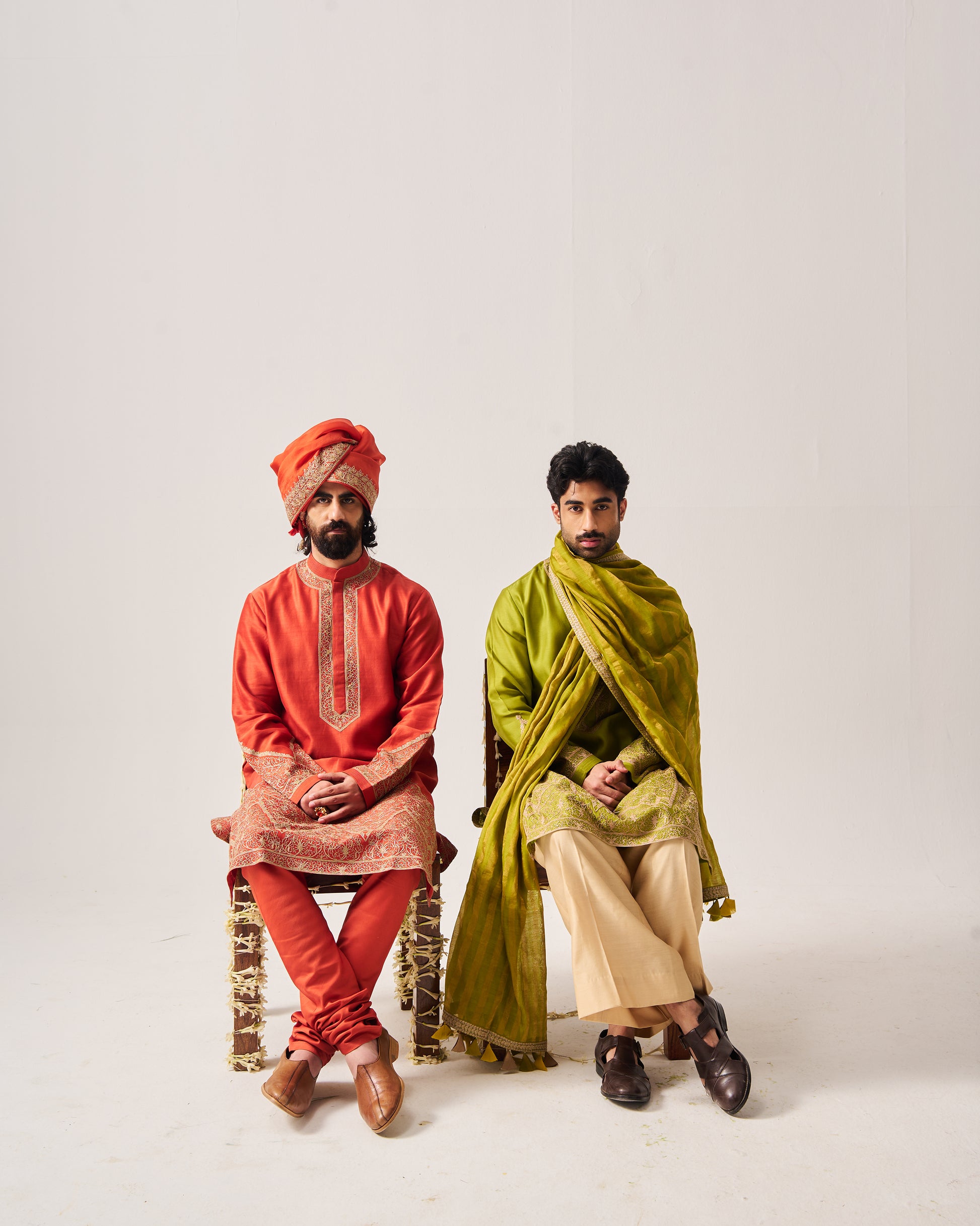 Chanderi Handloom Kurta paired with Churidar Pants. Featuring Intricate Zari Dori and Marodi Embroidery.