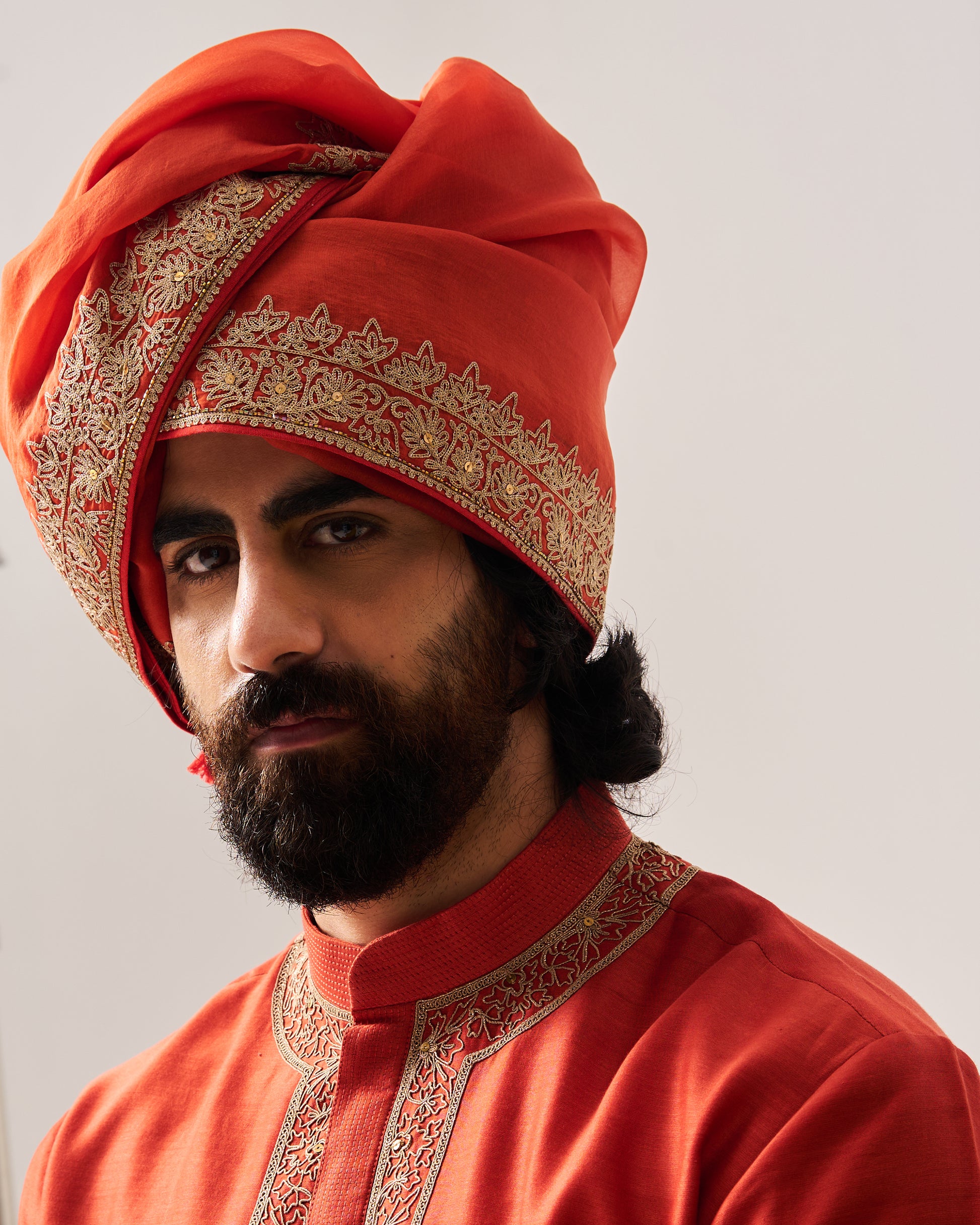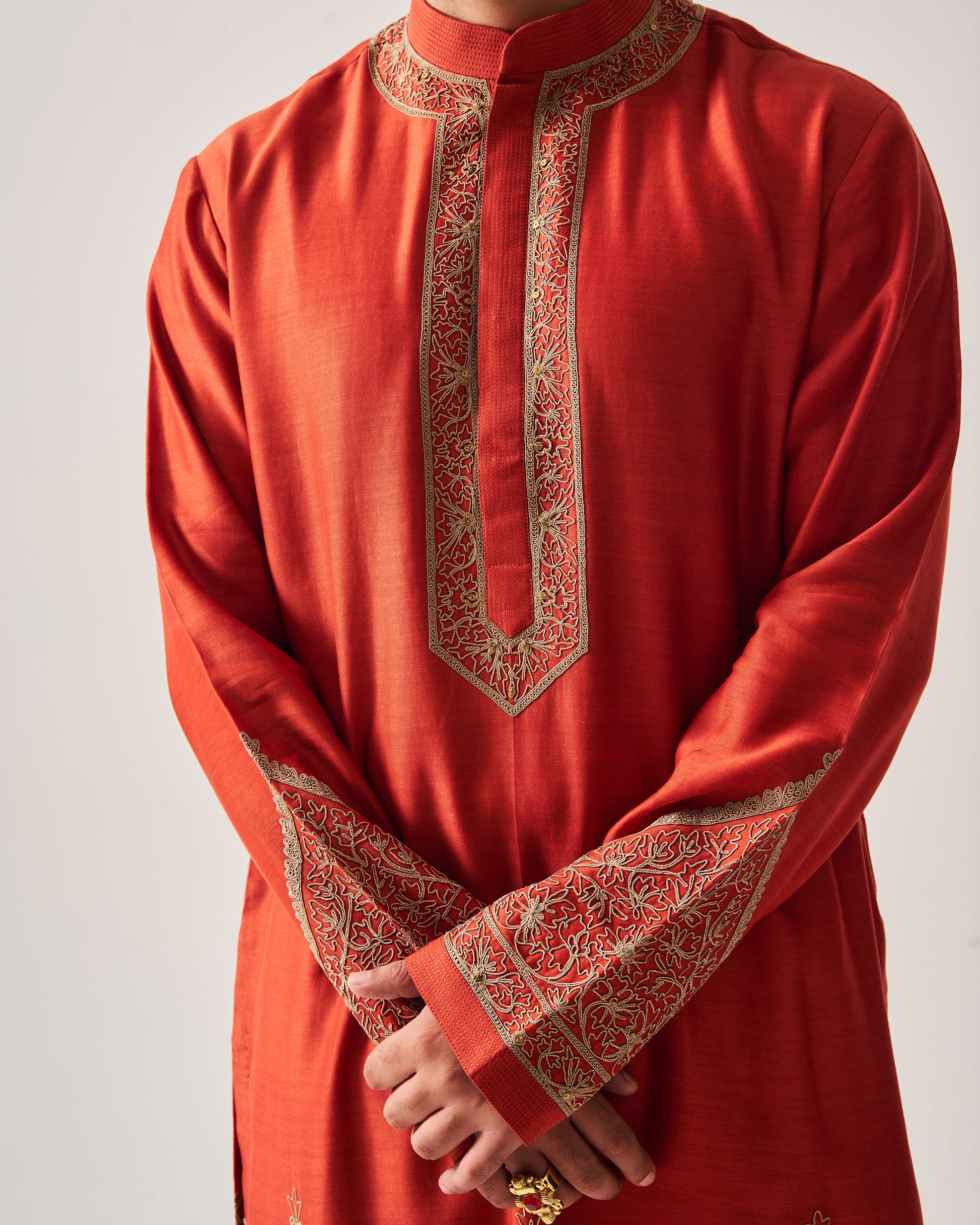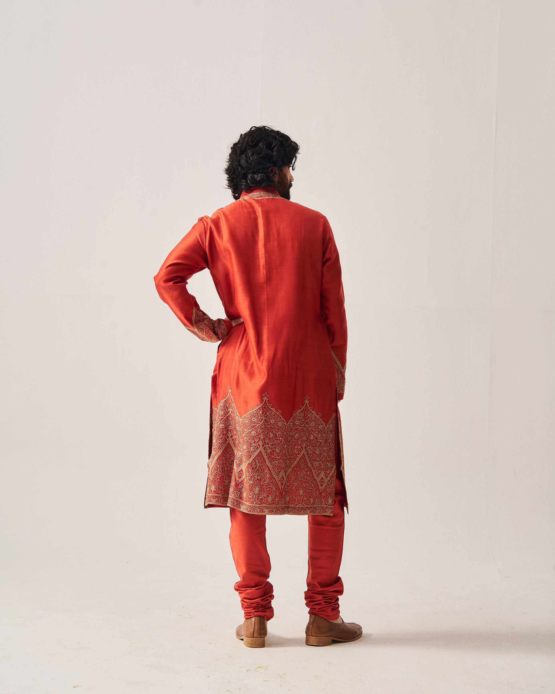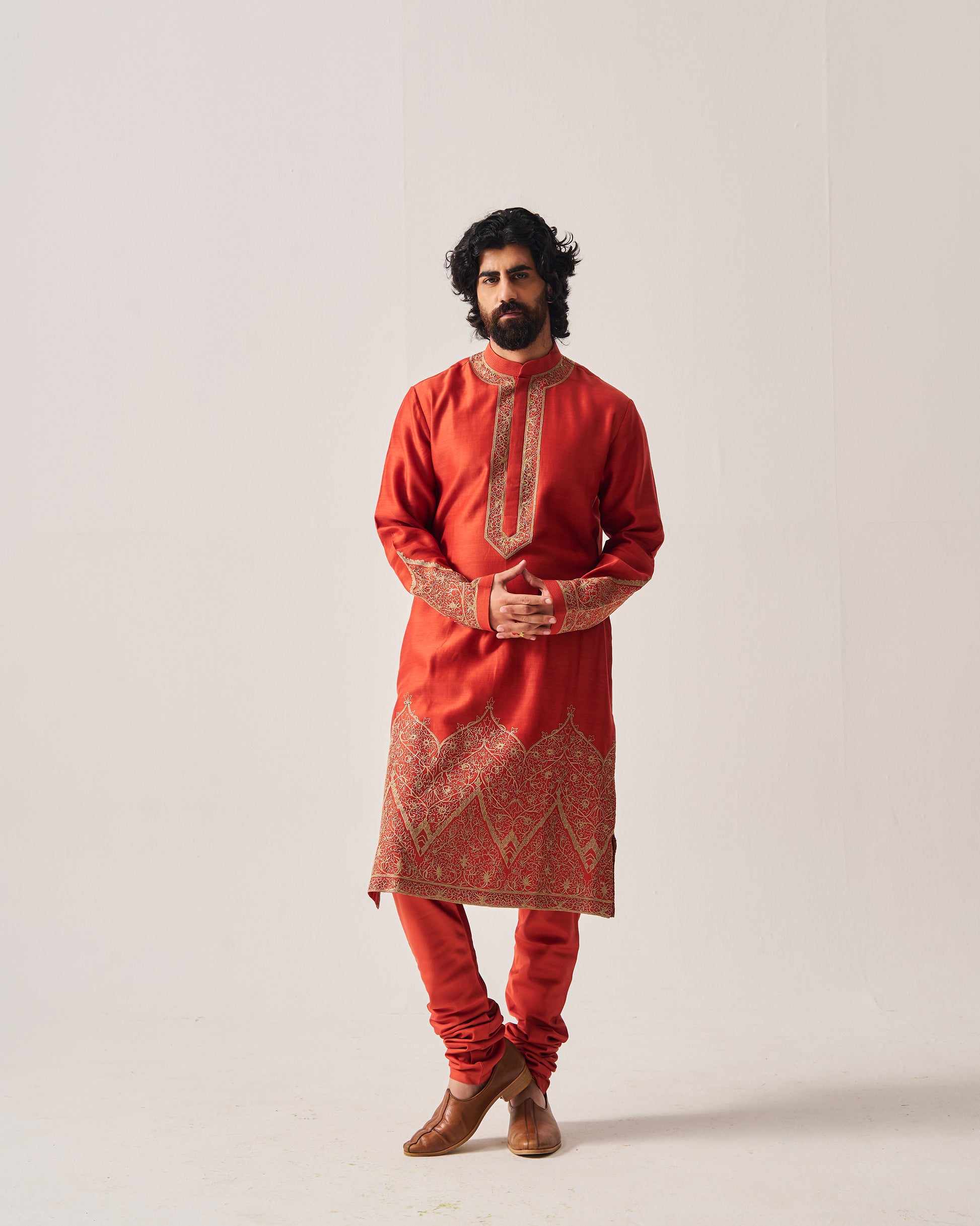 Chanderi Handloom Kurta paired with Churidar Pants. Featuring Intricate Zari Dori and Marodi Embroidery.