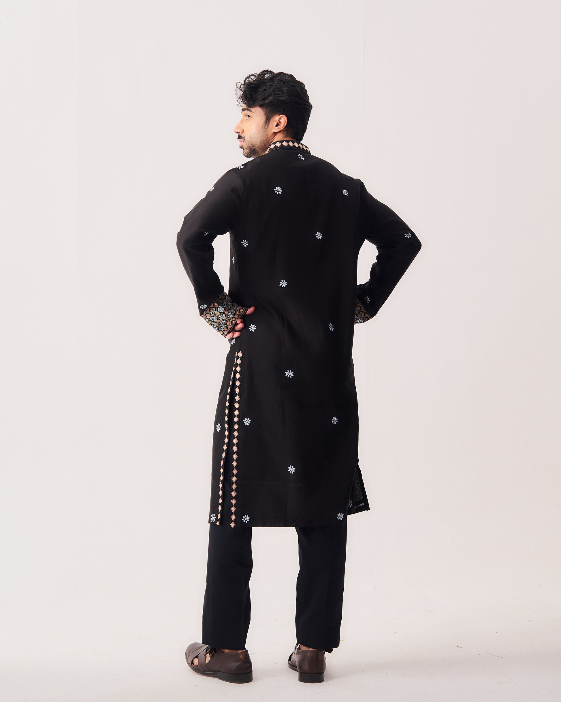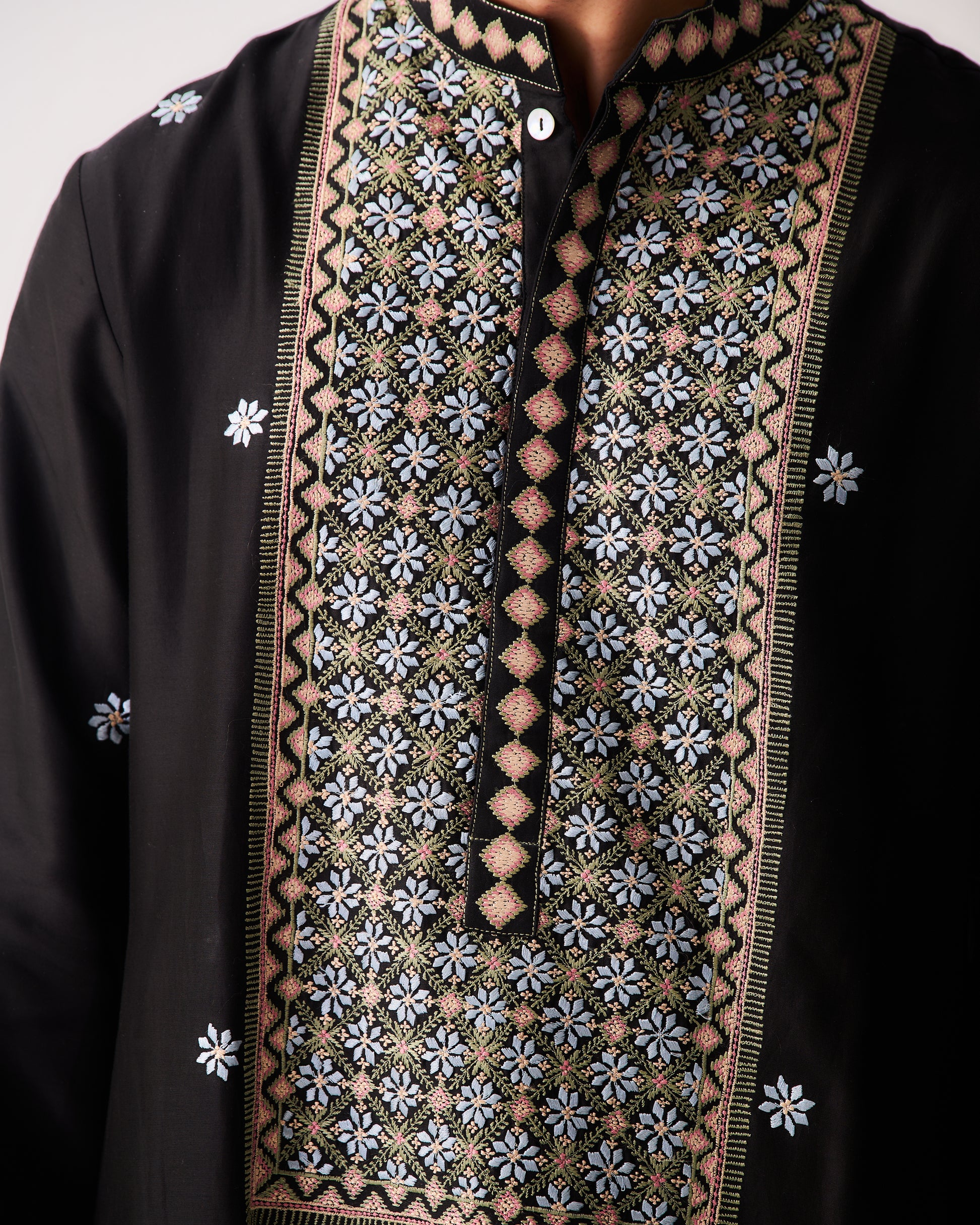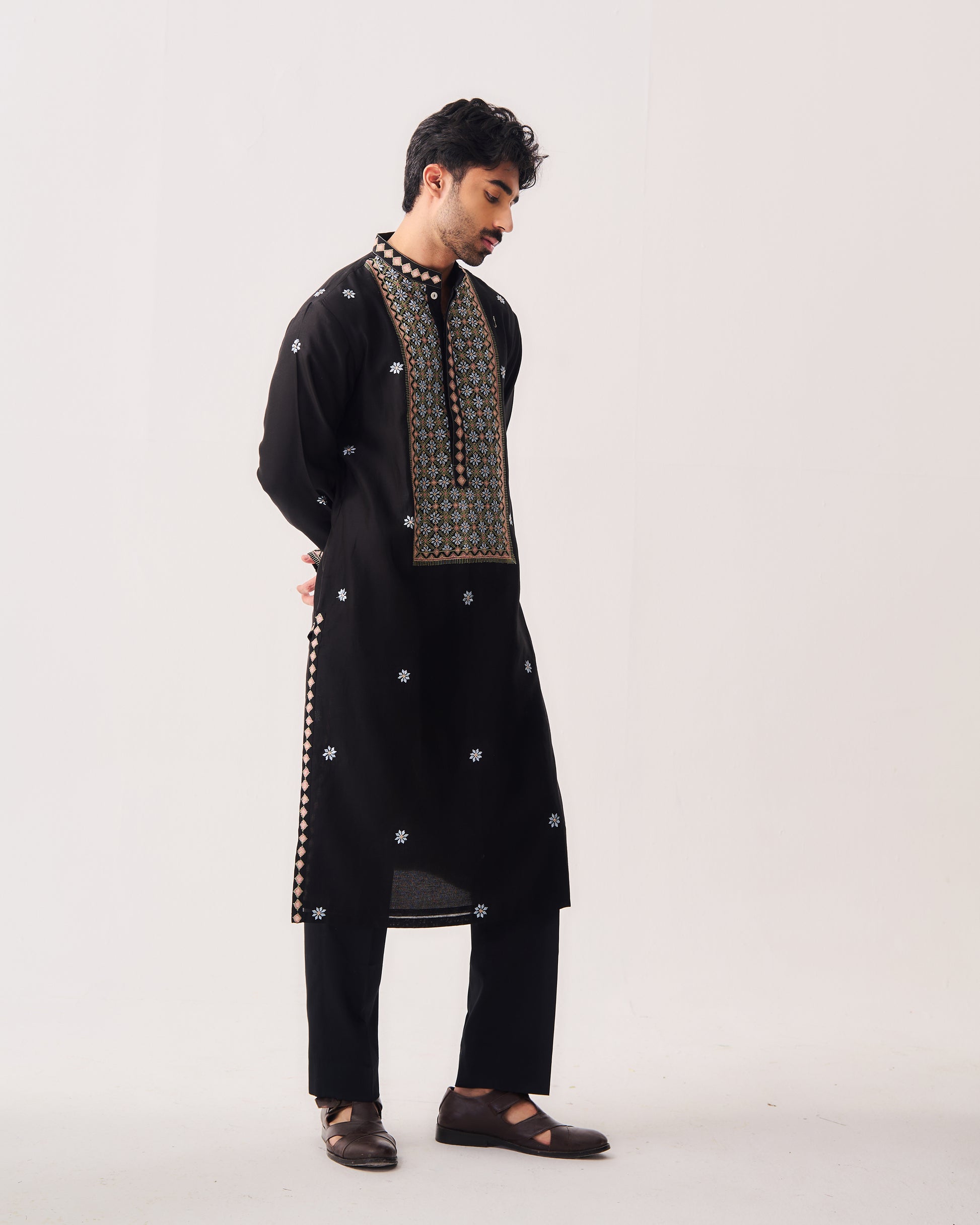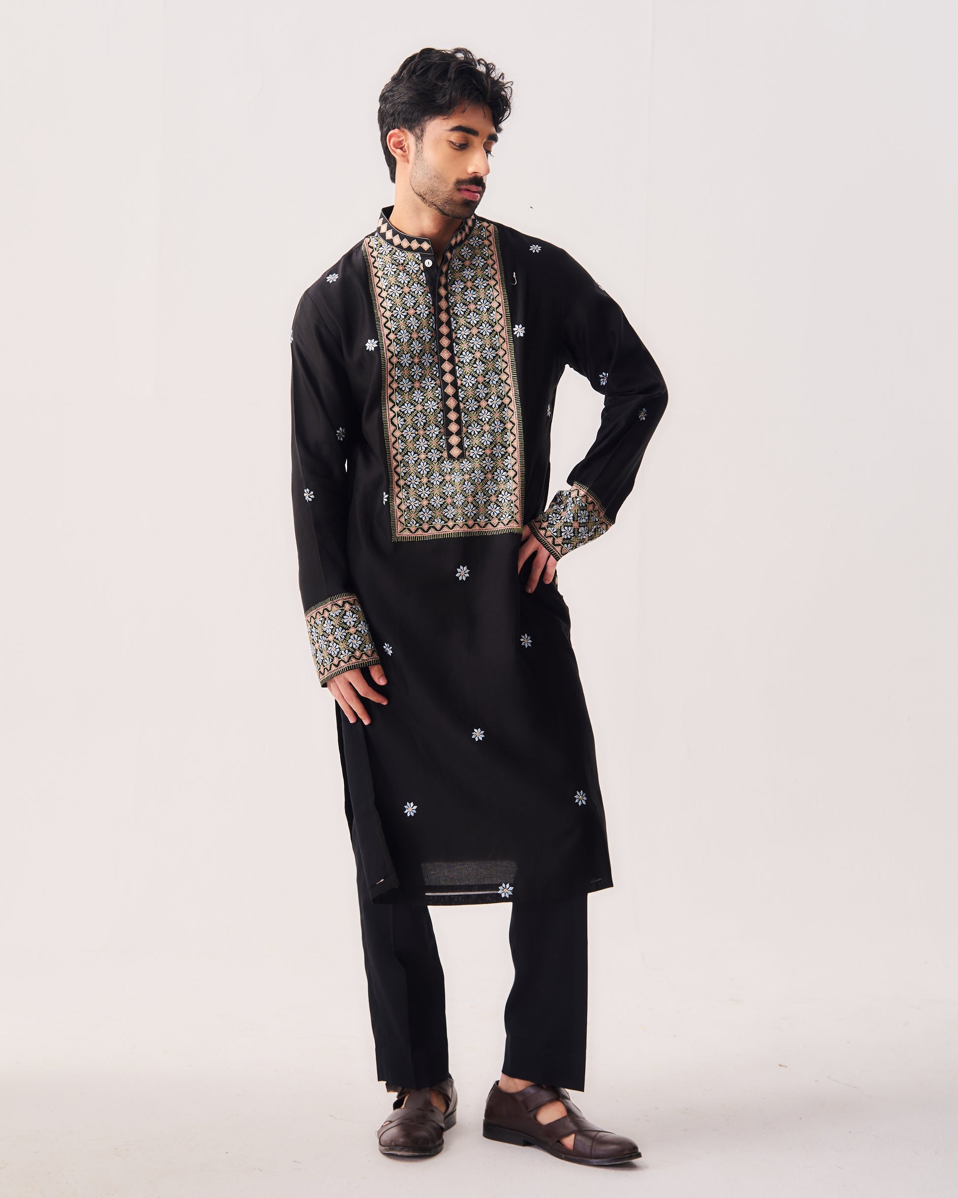 Chanderi Handloom Kurta paired with Pyjama Pants. Featuring Intricate Multicolour Resham Embroidery.