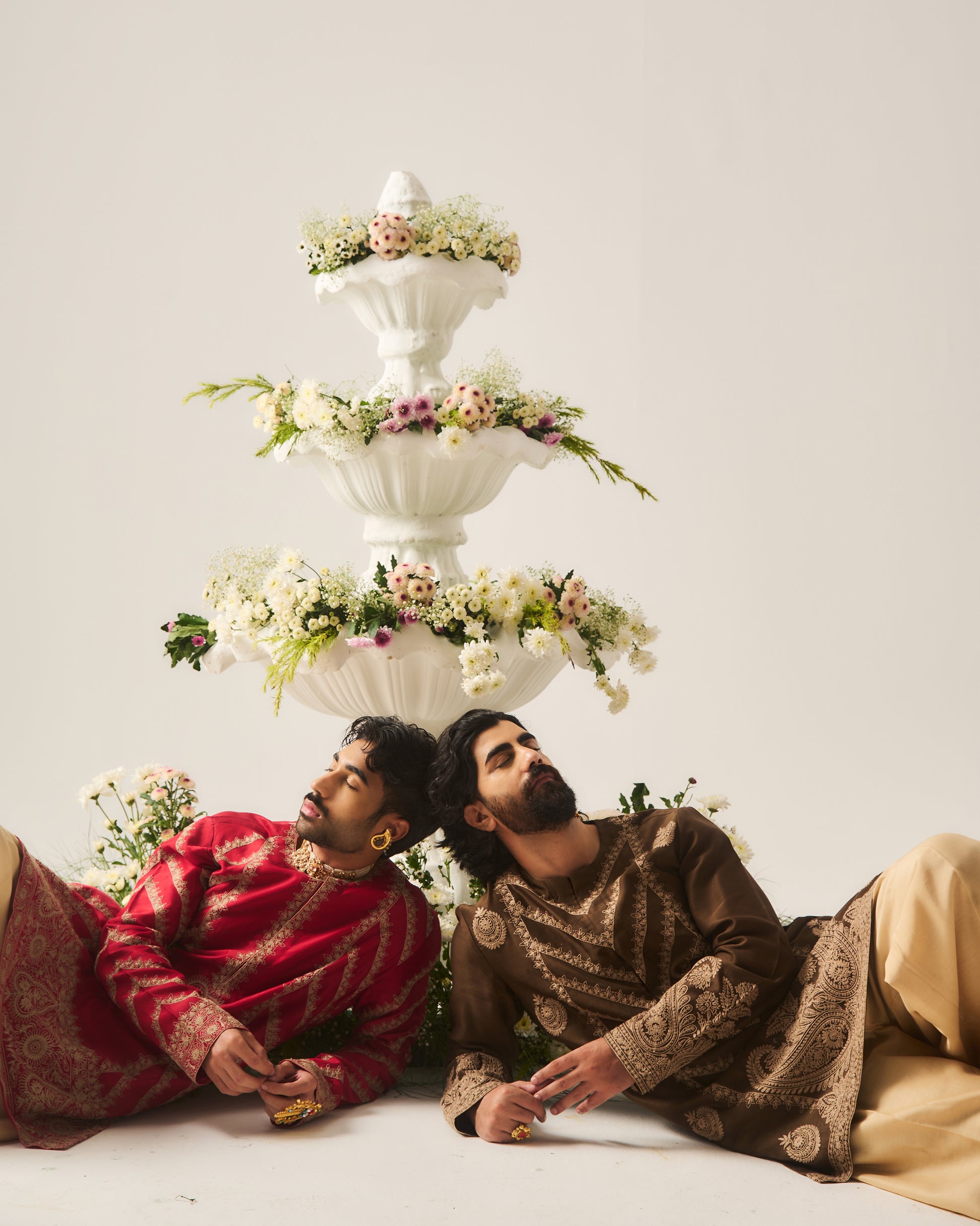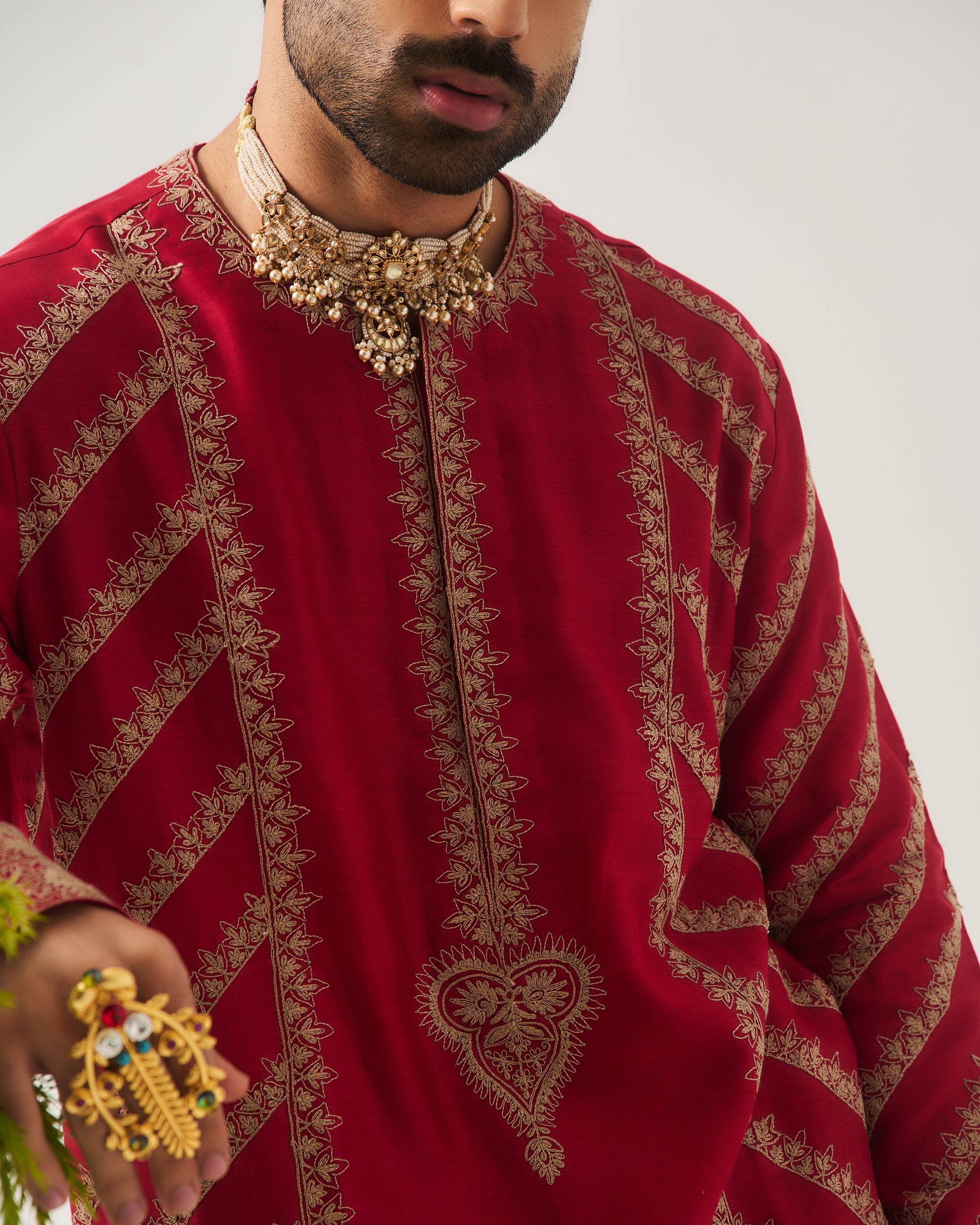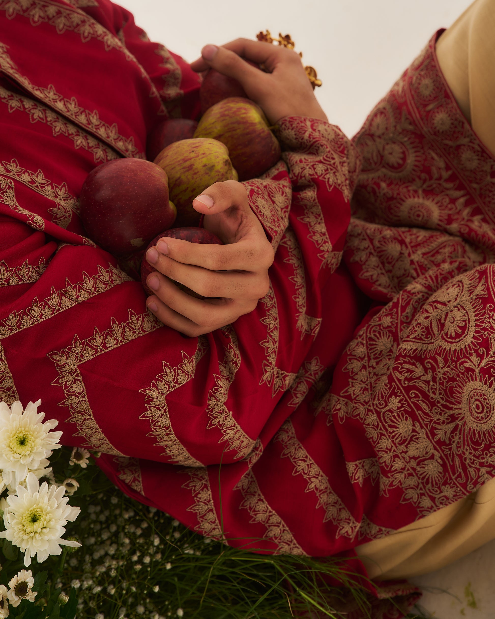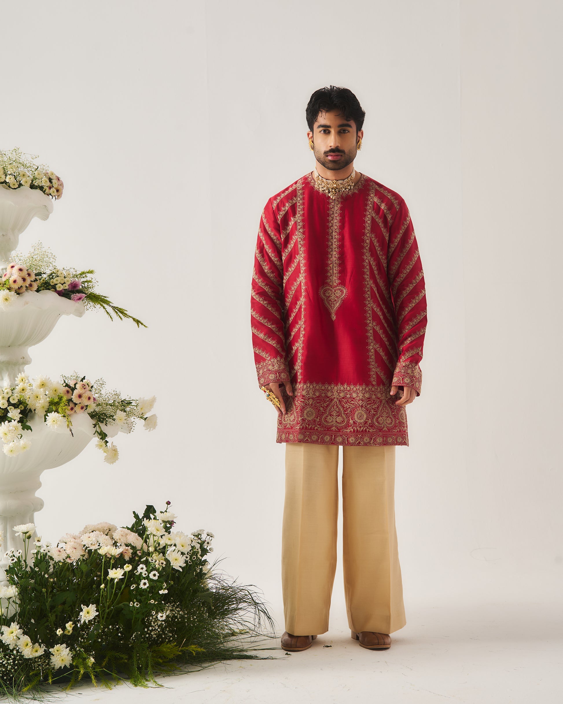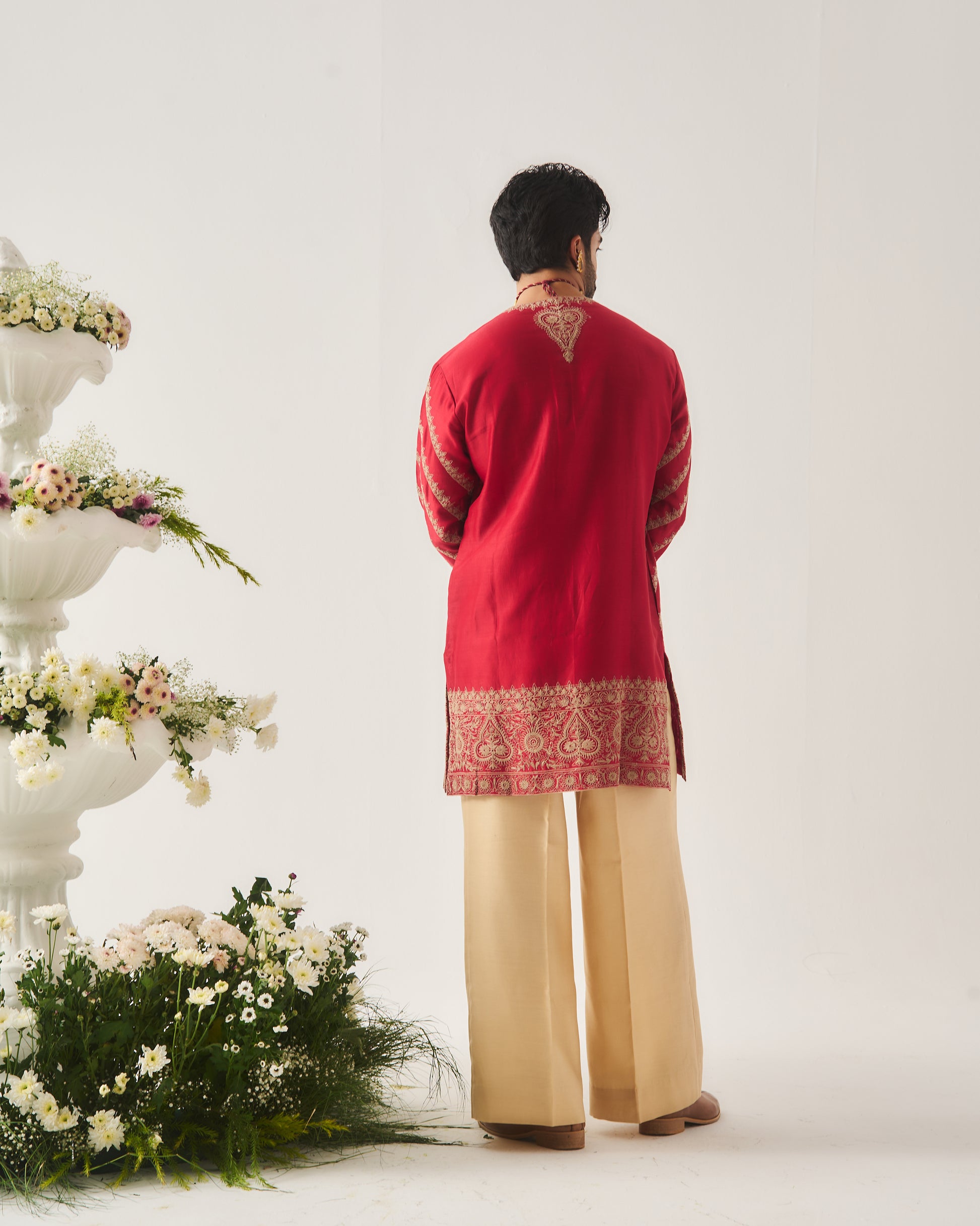 Chanderi Handloom Short Kurta paired with Flare Pants. Featuring Intricate Dori and Marodi Embroidery.