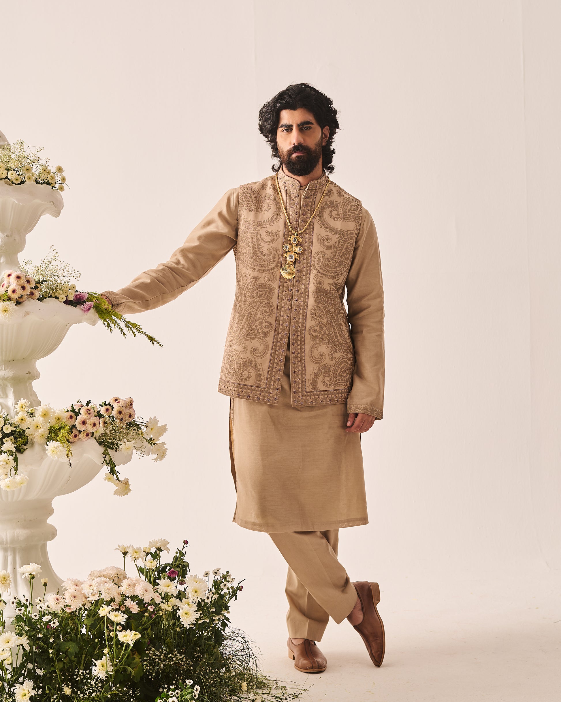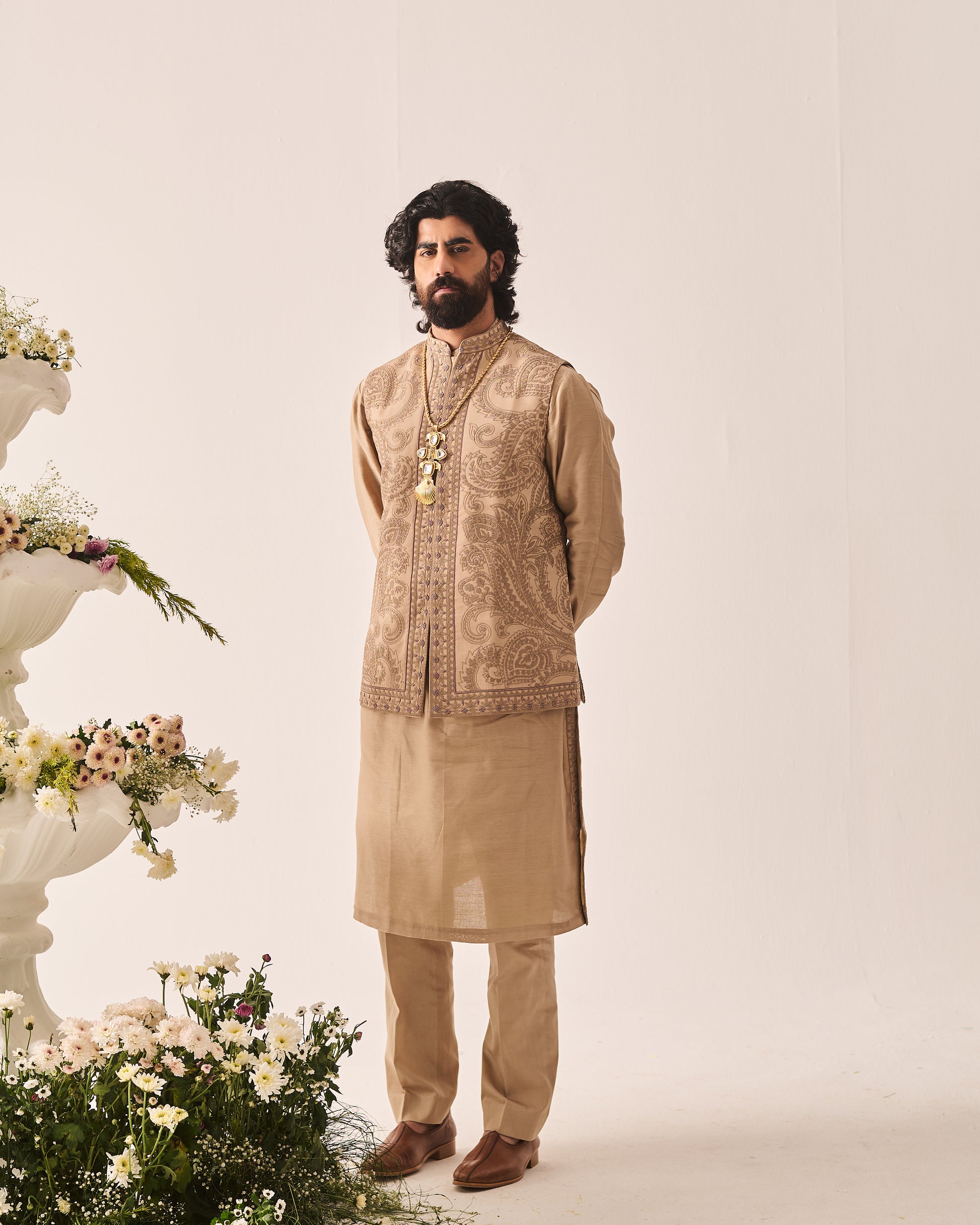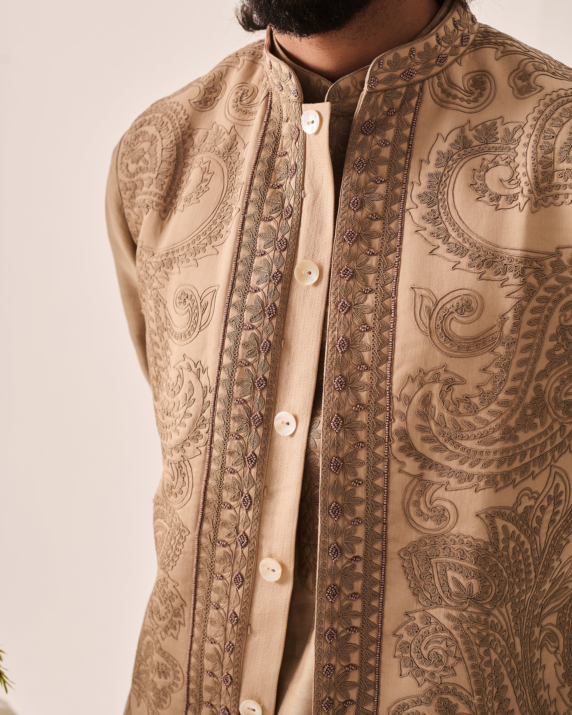 Chanderi Handloom Kurta paired with Pyjama Pants and Bundi. Featuring Intricate Dori and Marodi Embroidery with Hand Highlights of Pearl Beads.