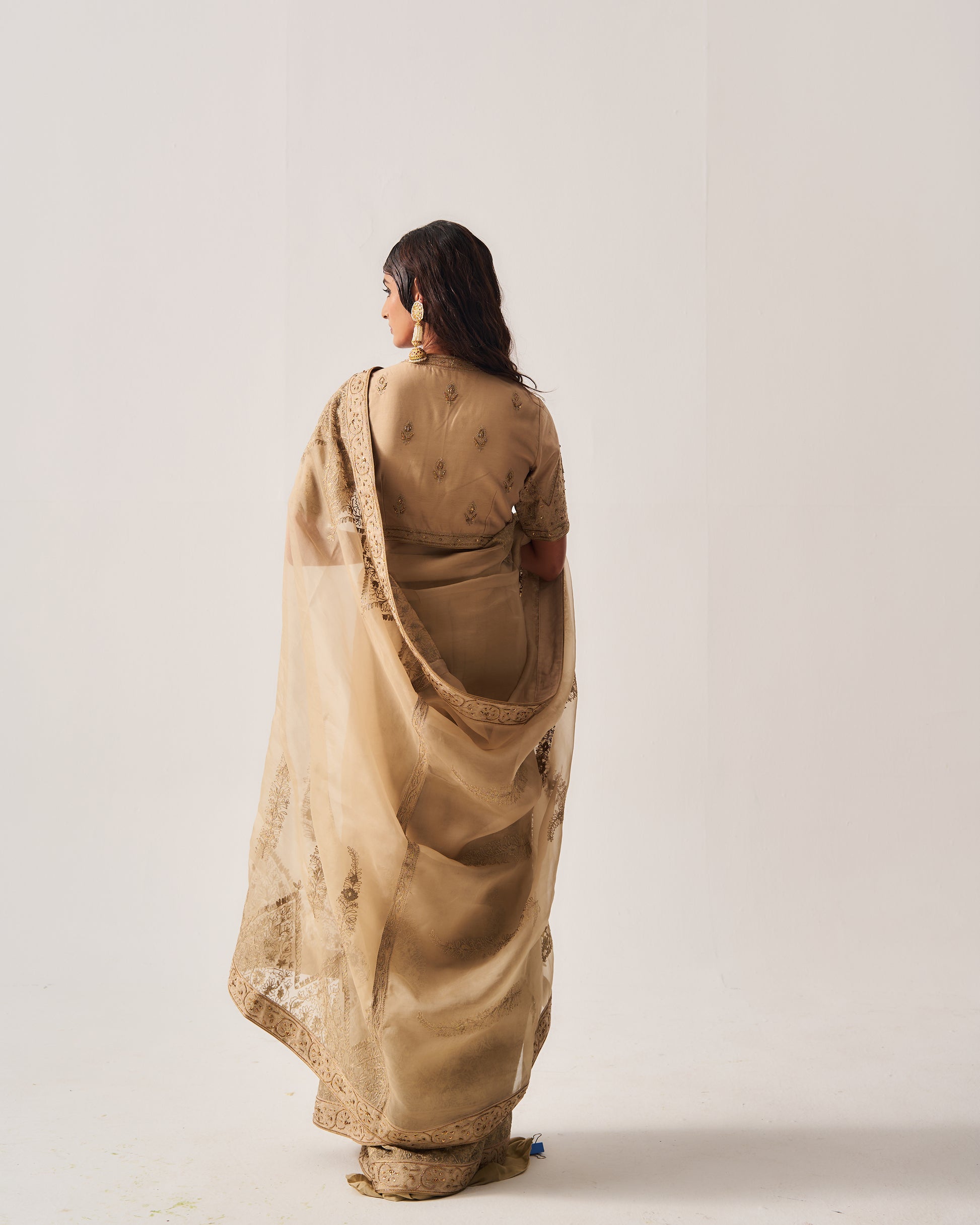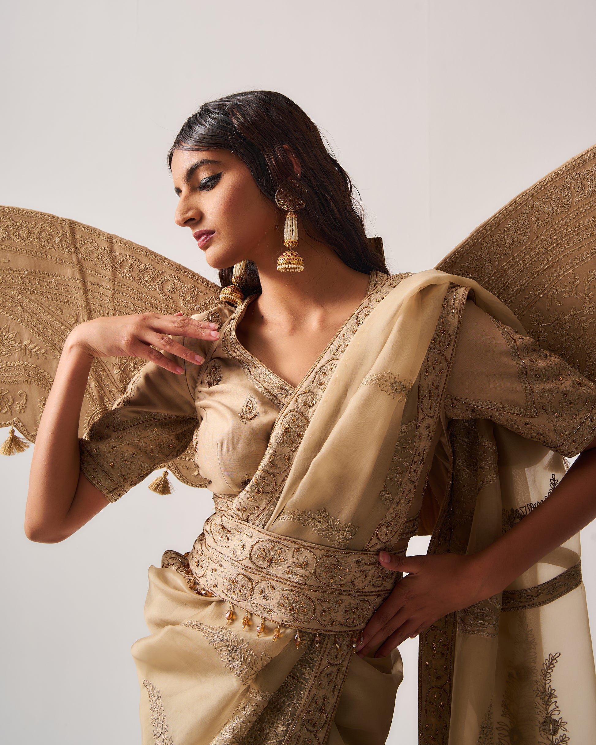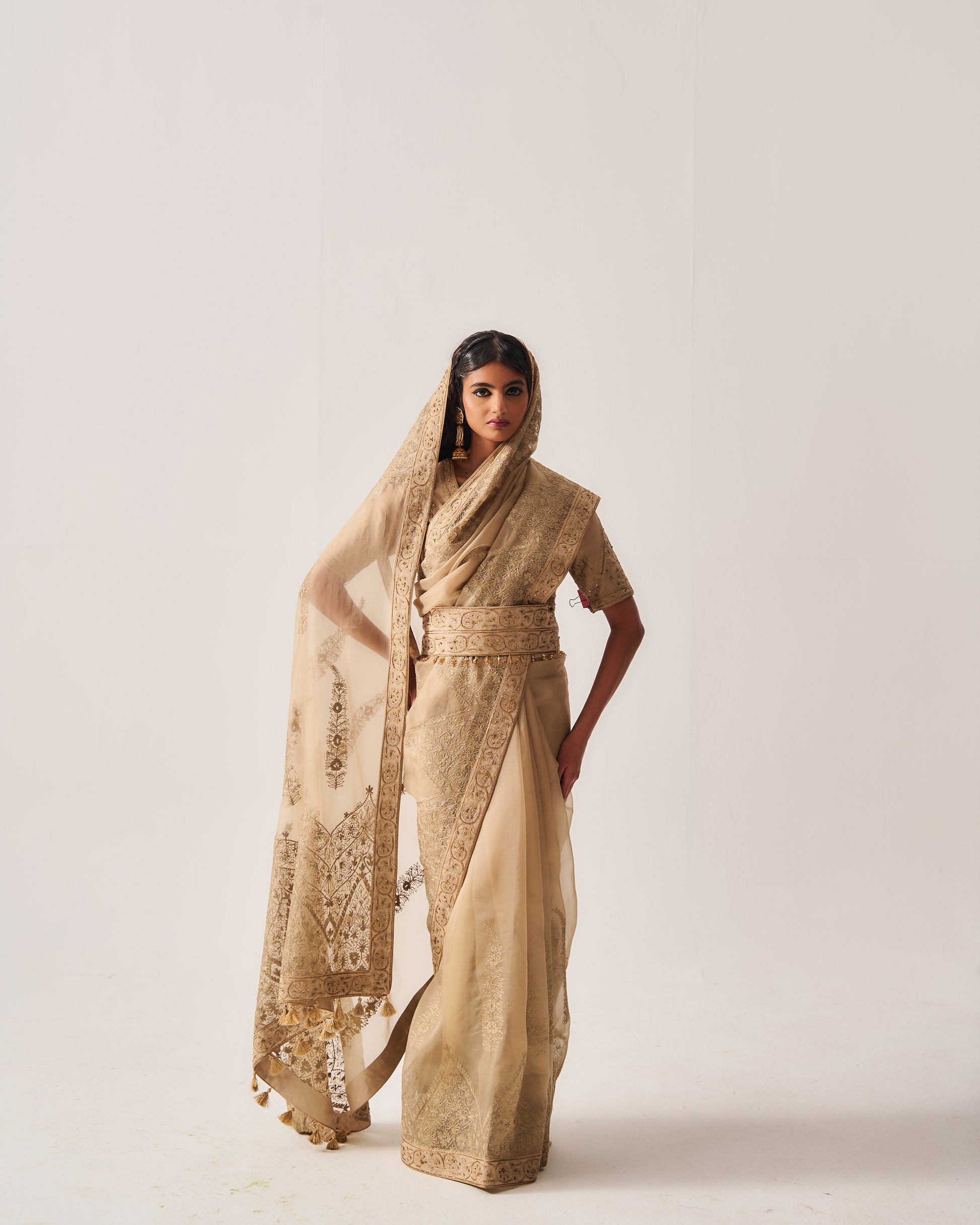 Organza Silk Saree paired with Stitched Blouse and Belt. Featuring Intricate Zari Aari Embroidery with Hand Highlights of Sequin, Cut Dana, and Beads.