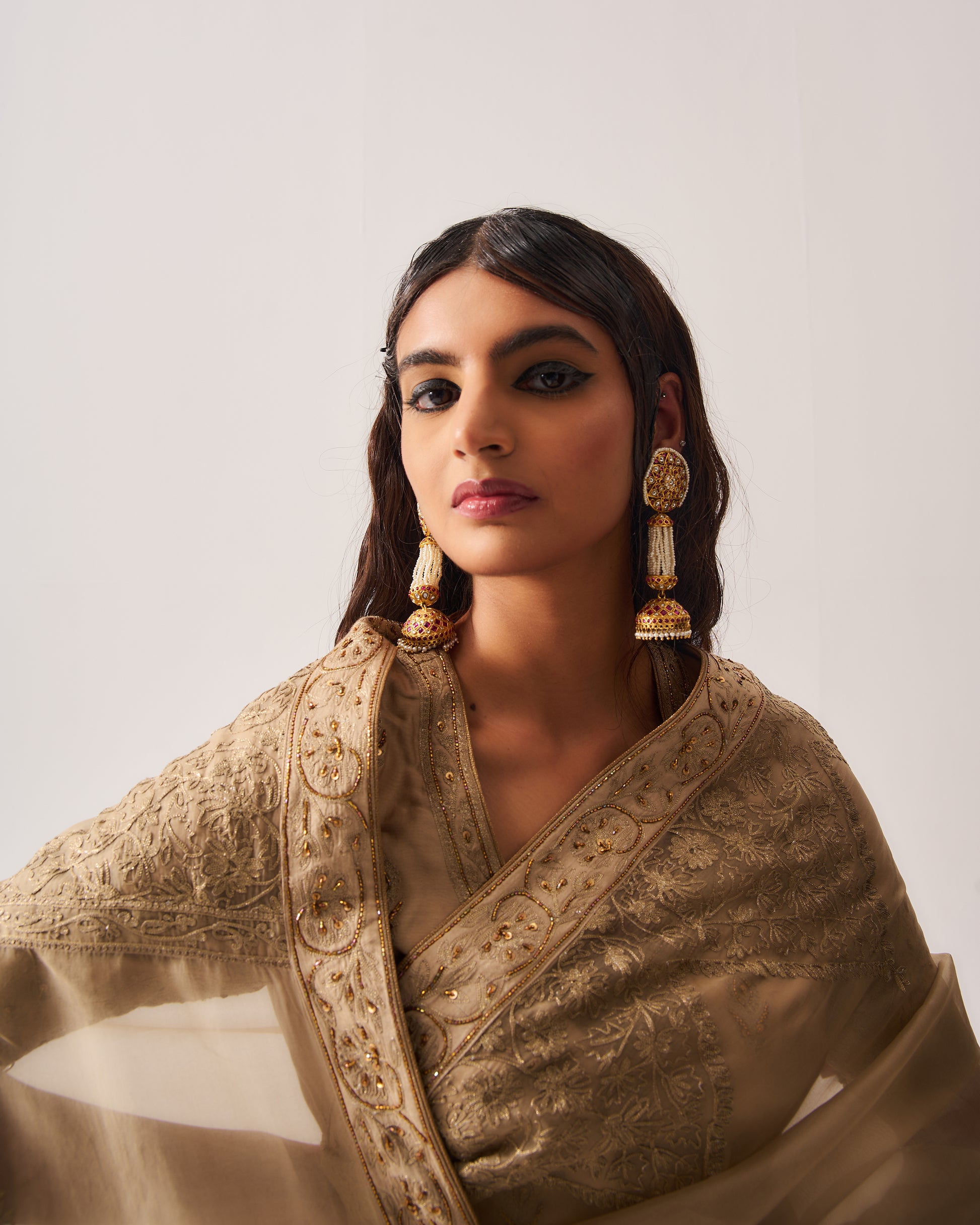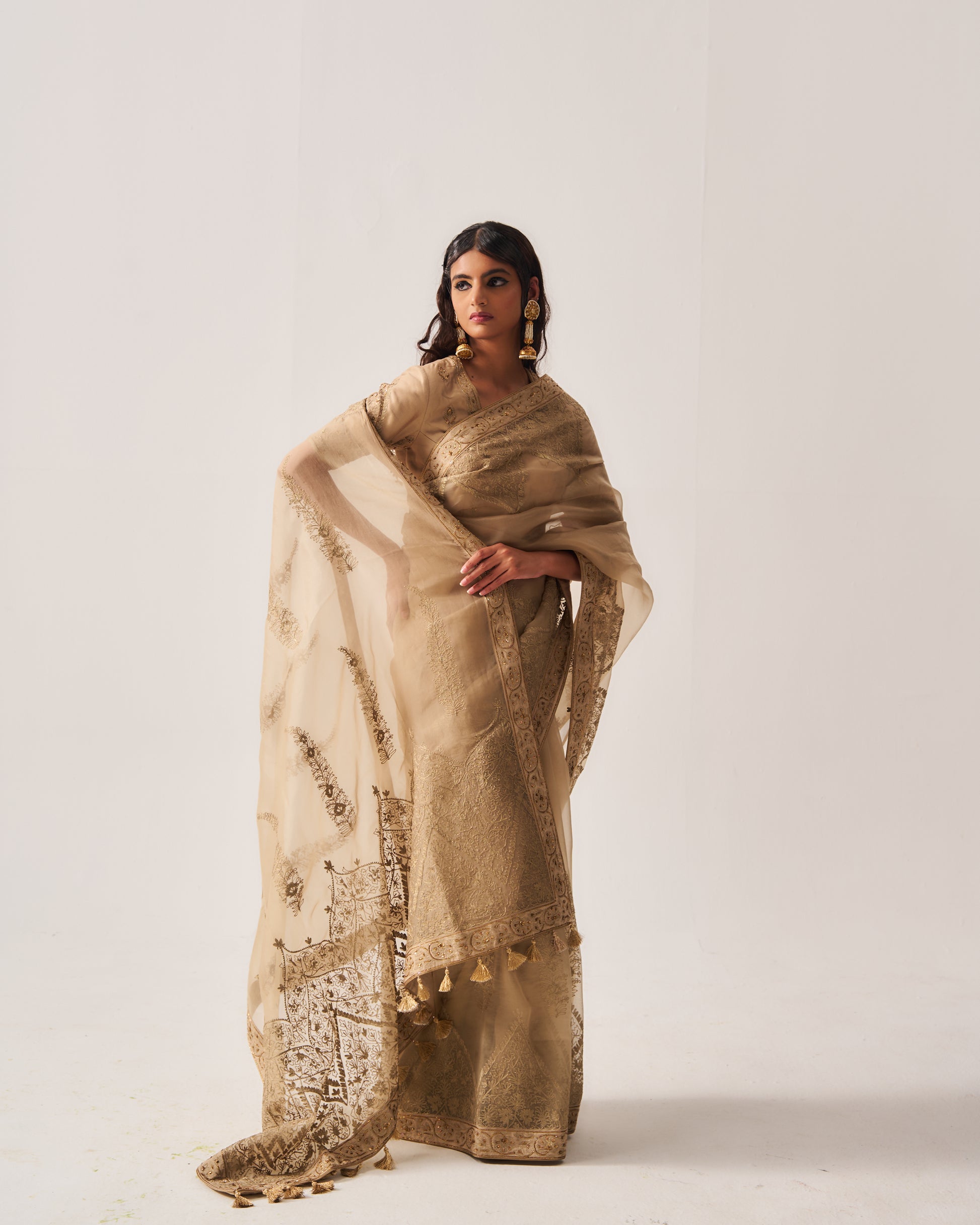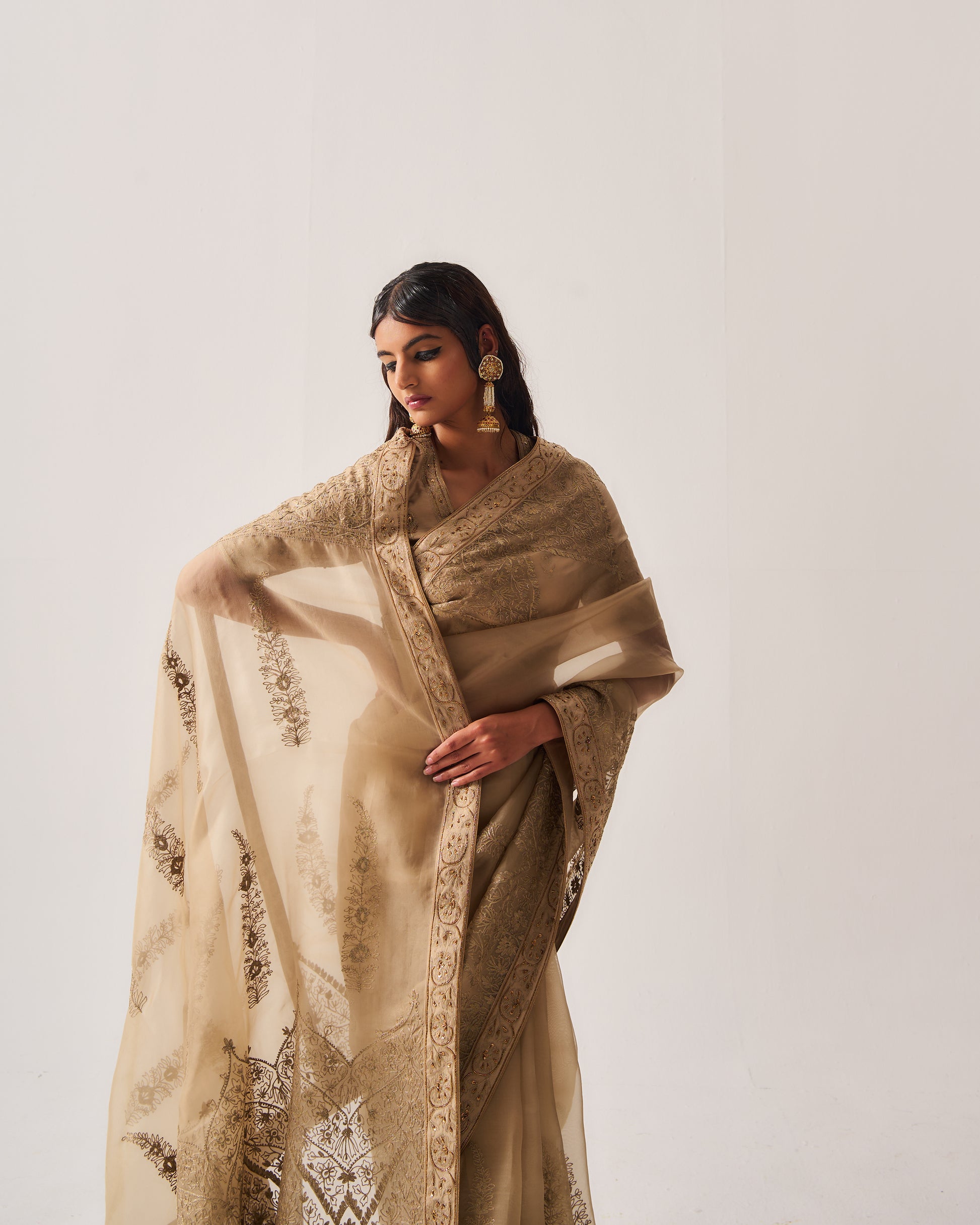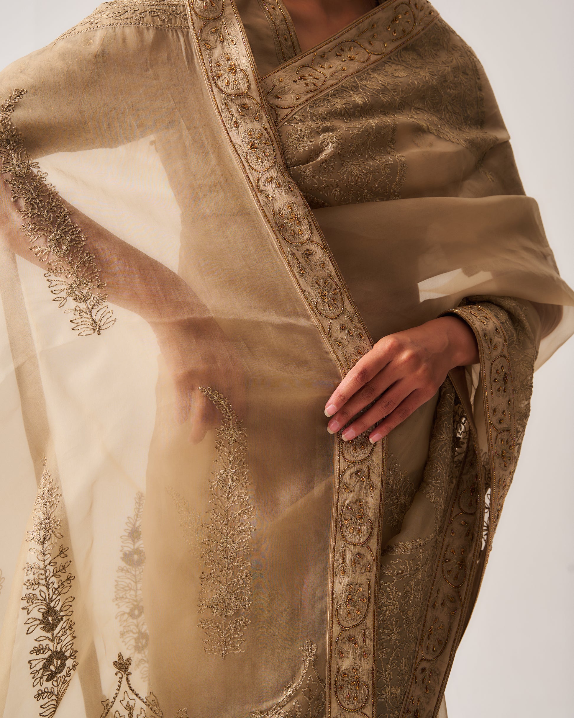 Organza Silk Saree paired with Stitched Blouse and Belt. Featuring Intricate Zari Aari Embroidery with Hand Highlights of Sequin, Cut Dana, and Beads.