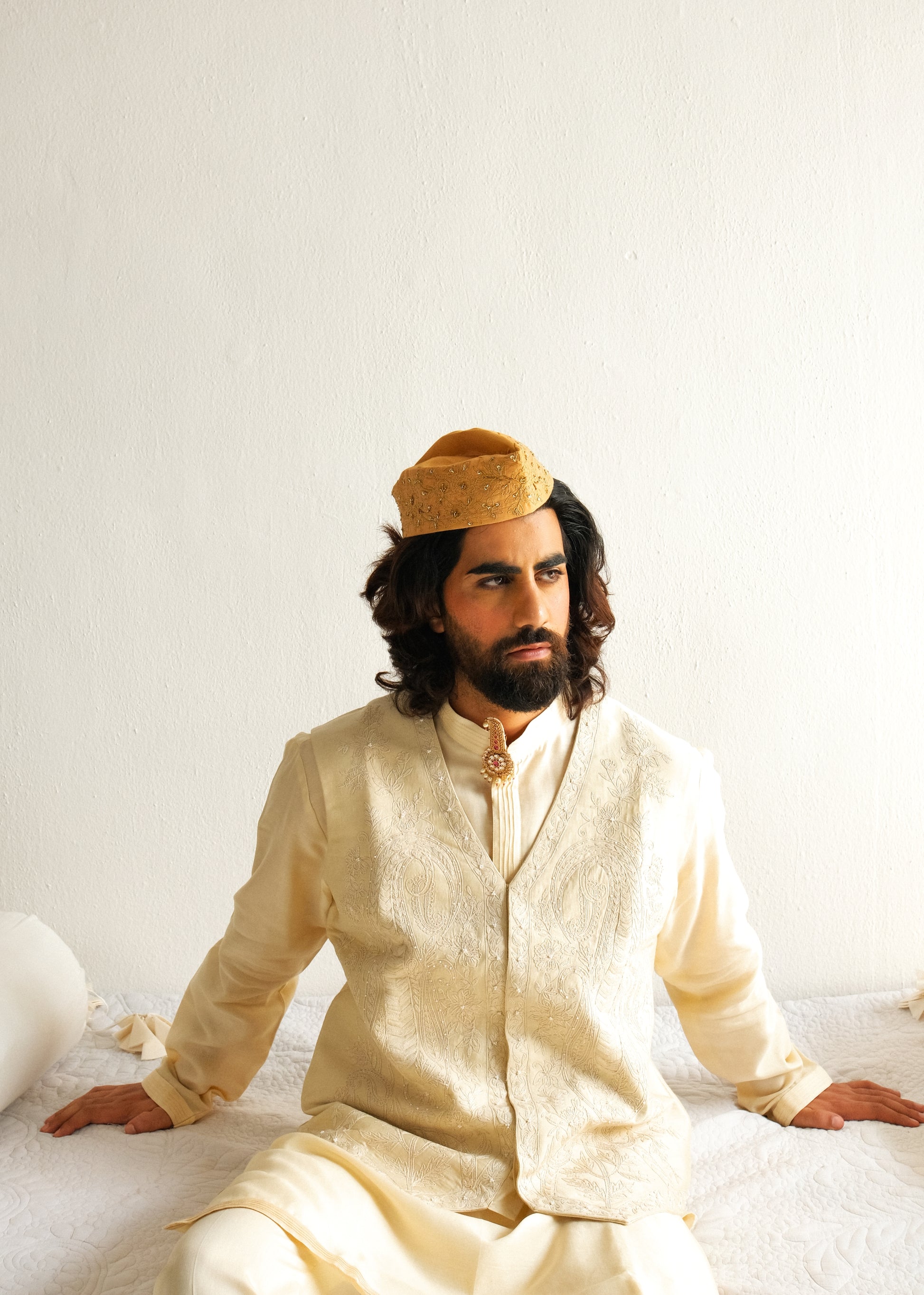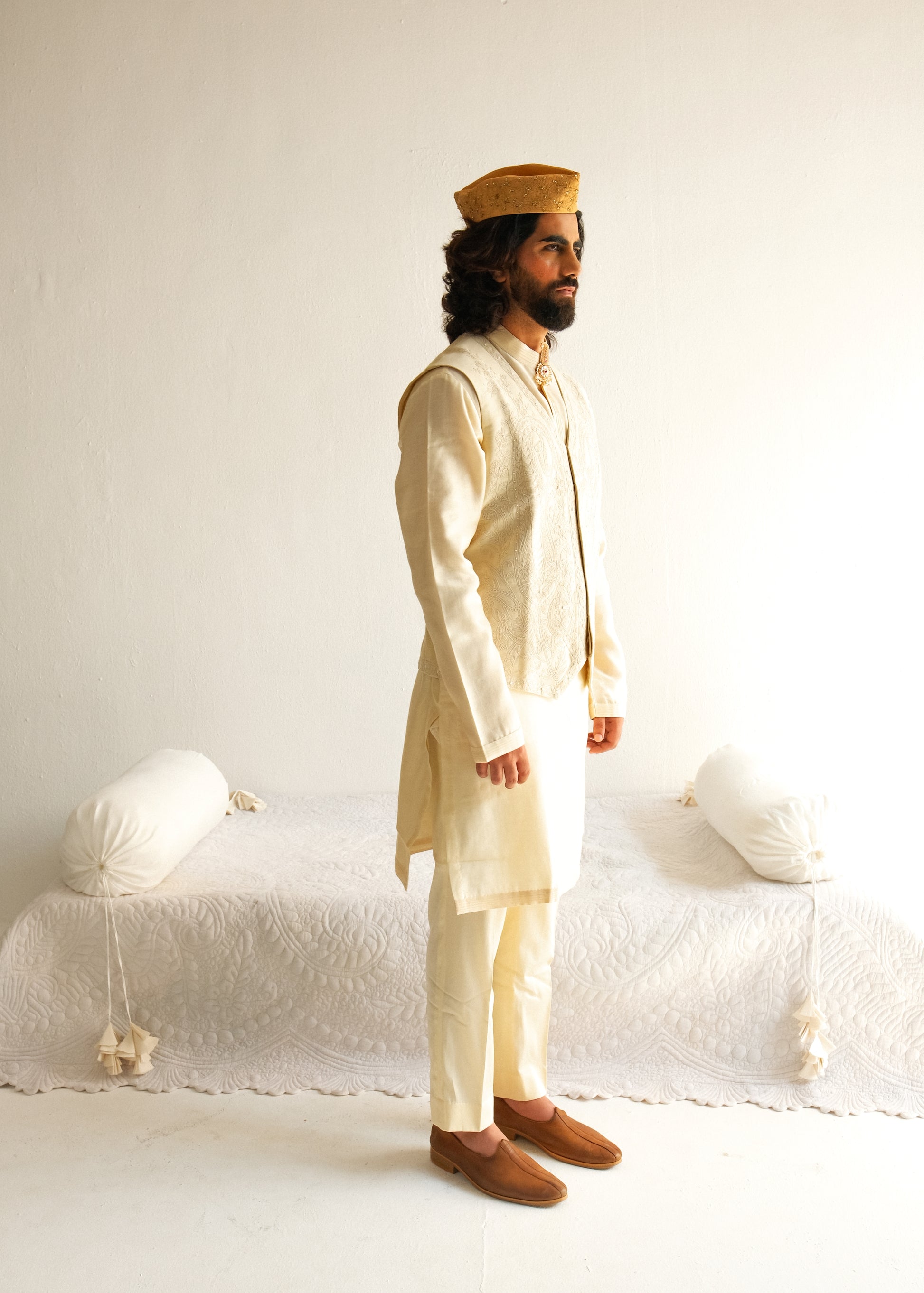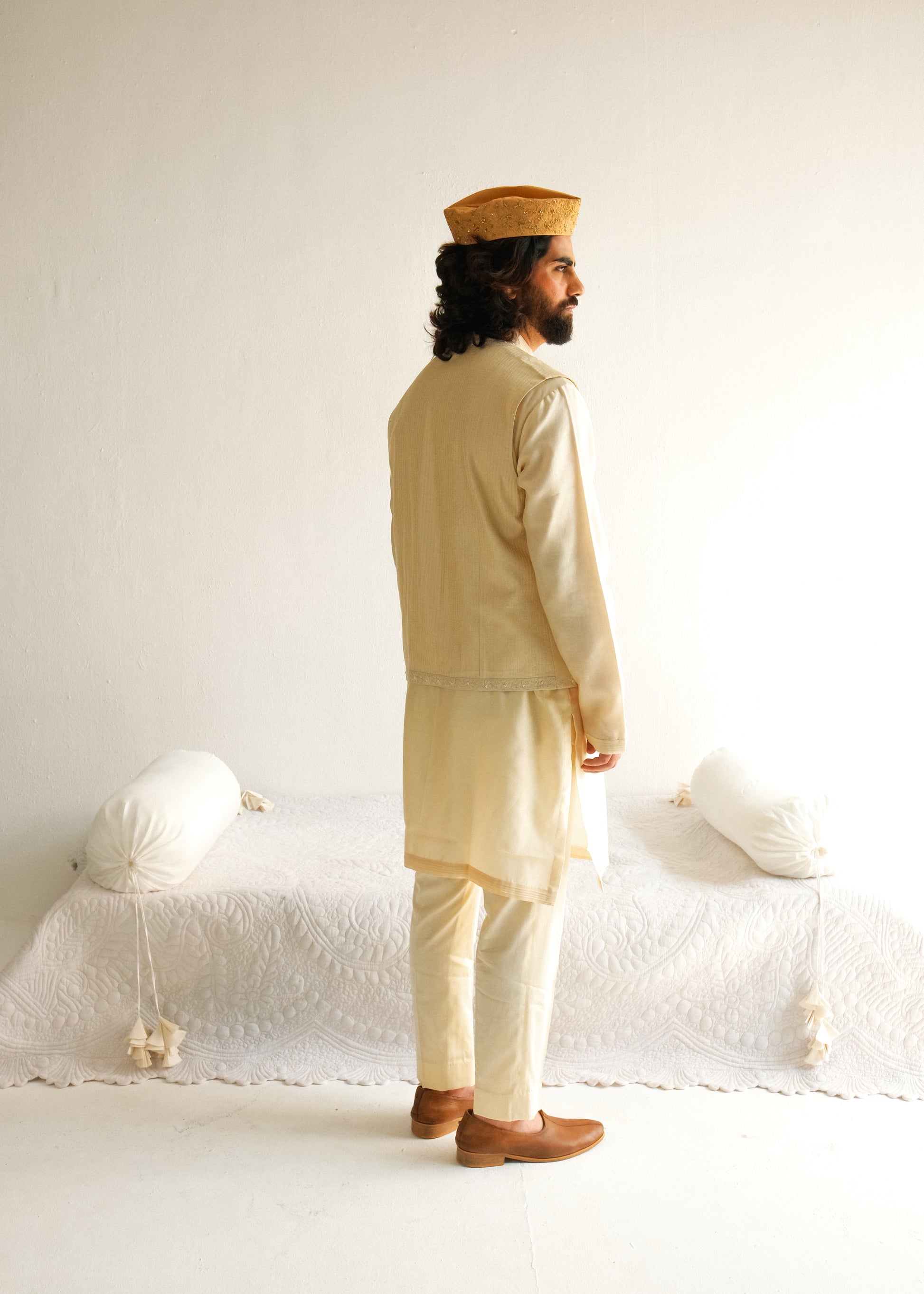 Chanderi Handloom Kurta paired with Pyjama Pants and Bundi. Featuring Intricate Dori and Marodi Embroidery with Hand Highlights of Beads.