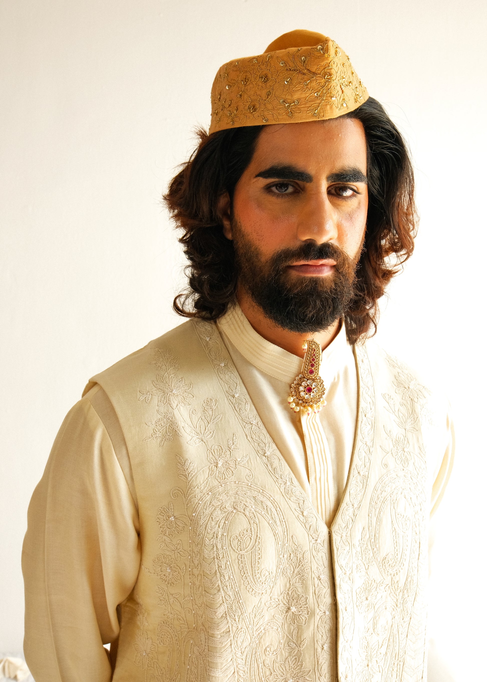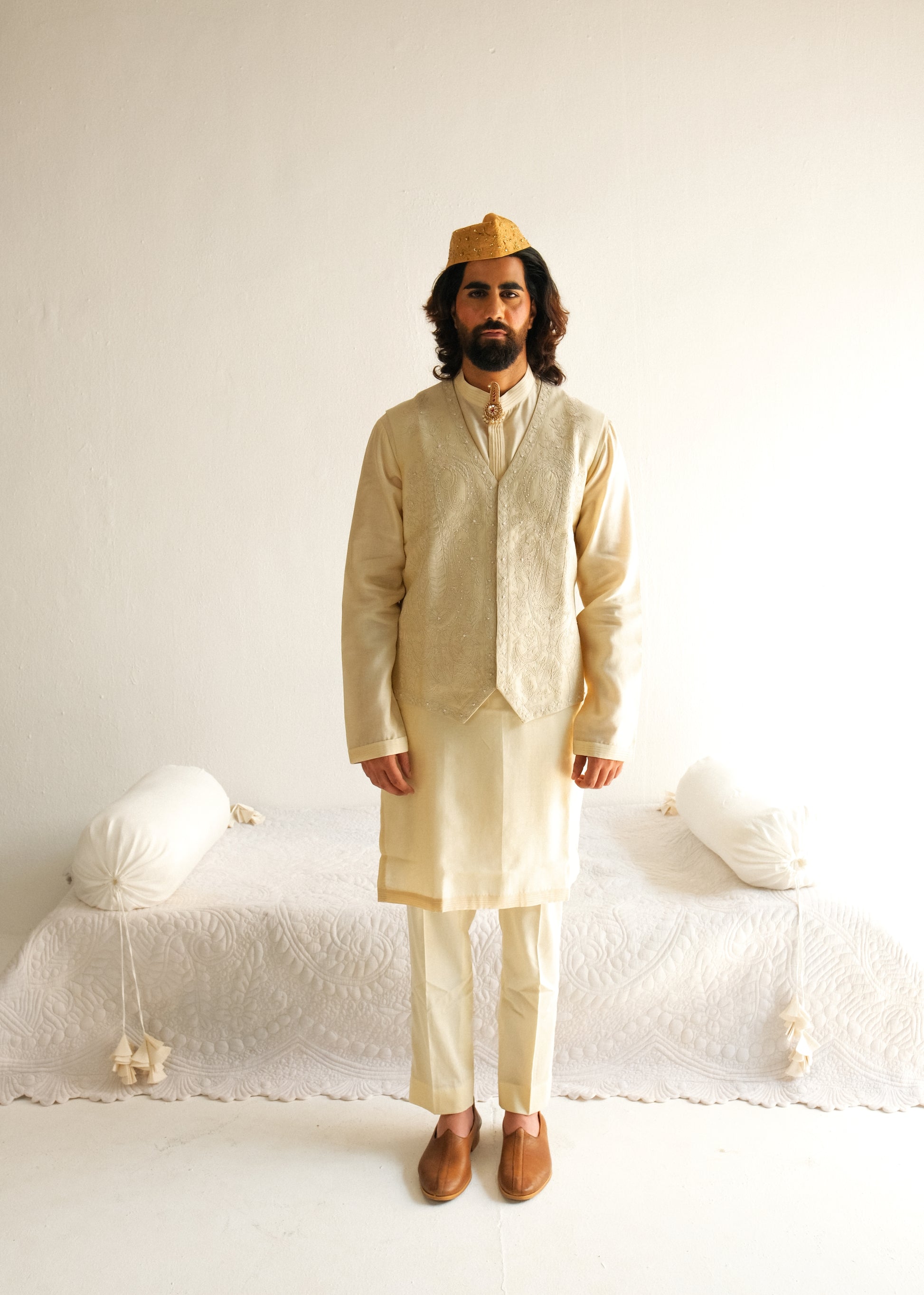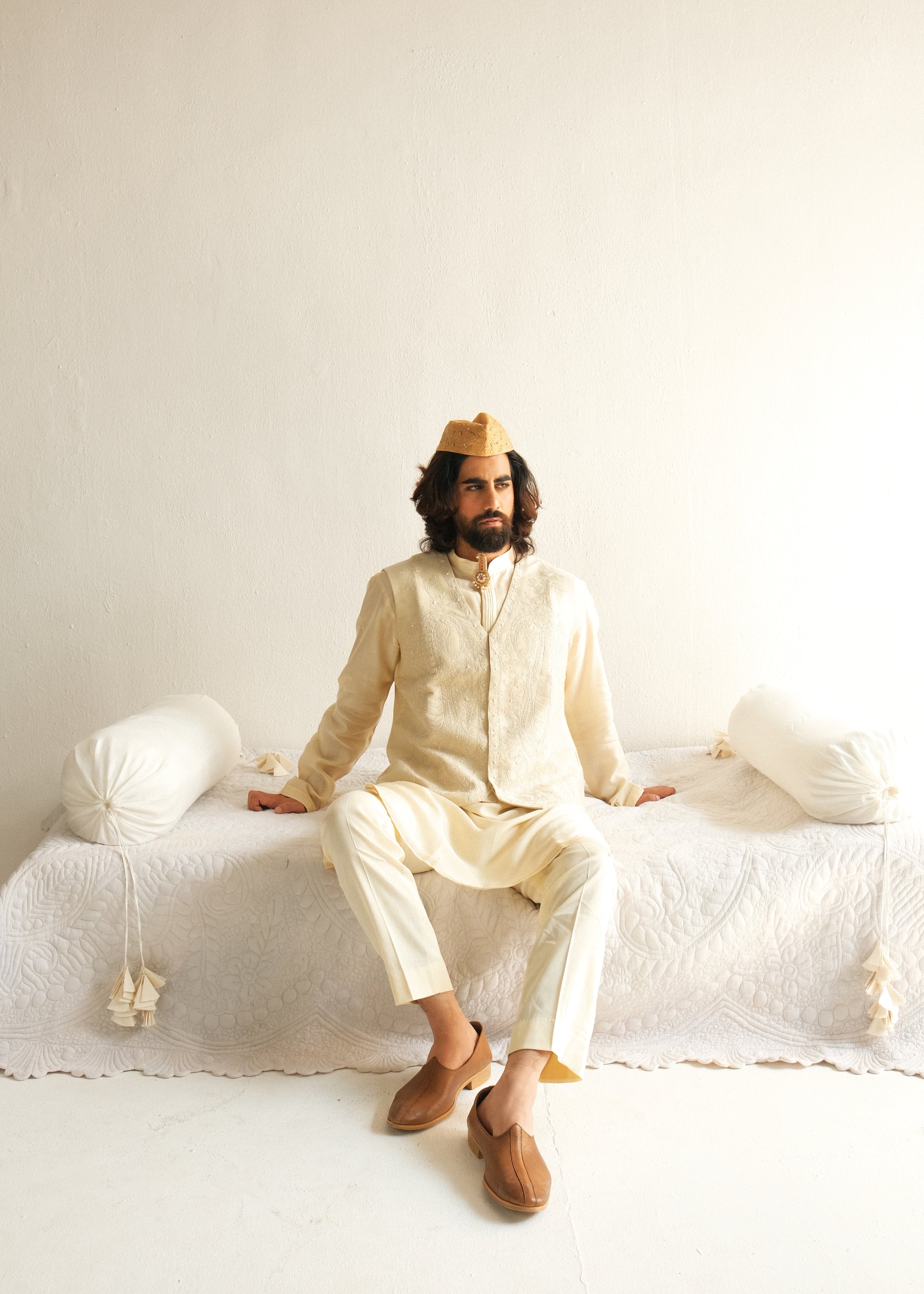 Chanderi Handloom Kurta paired with Pyjama Pants and Bundi. Featuring Intricate Dori and Marodi Embroidery with Hand Highlights of Beads.