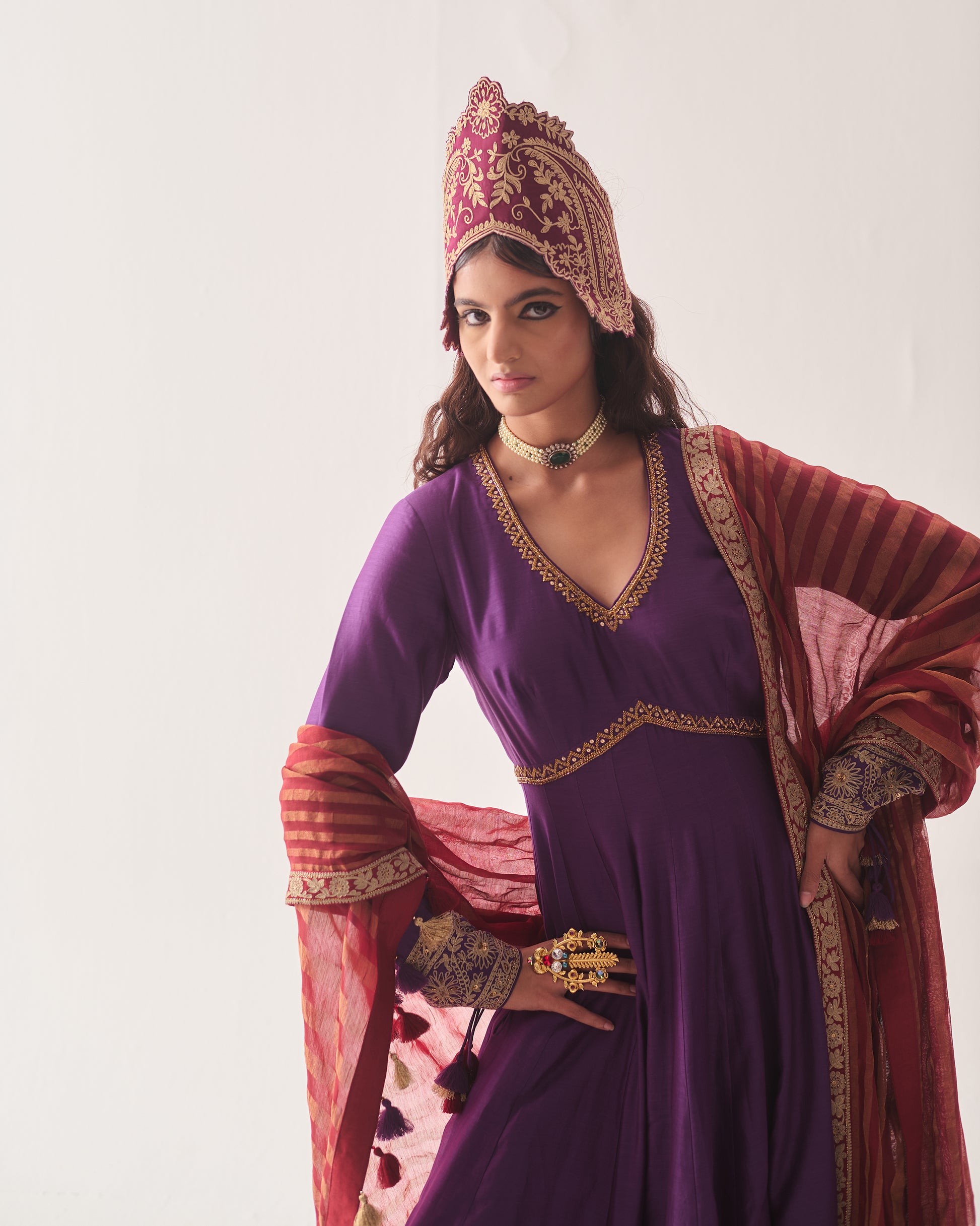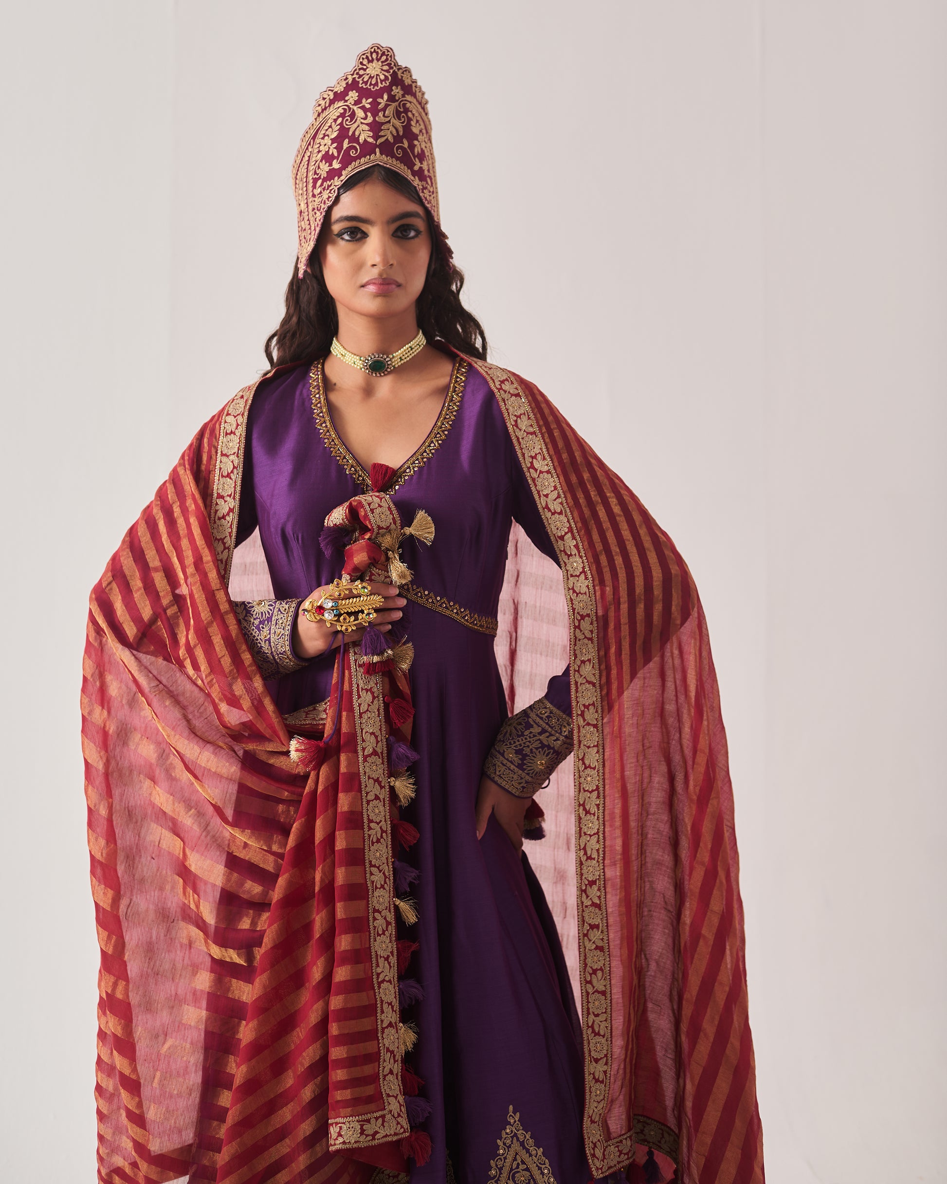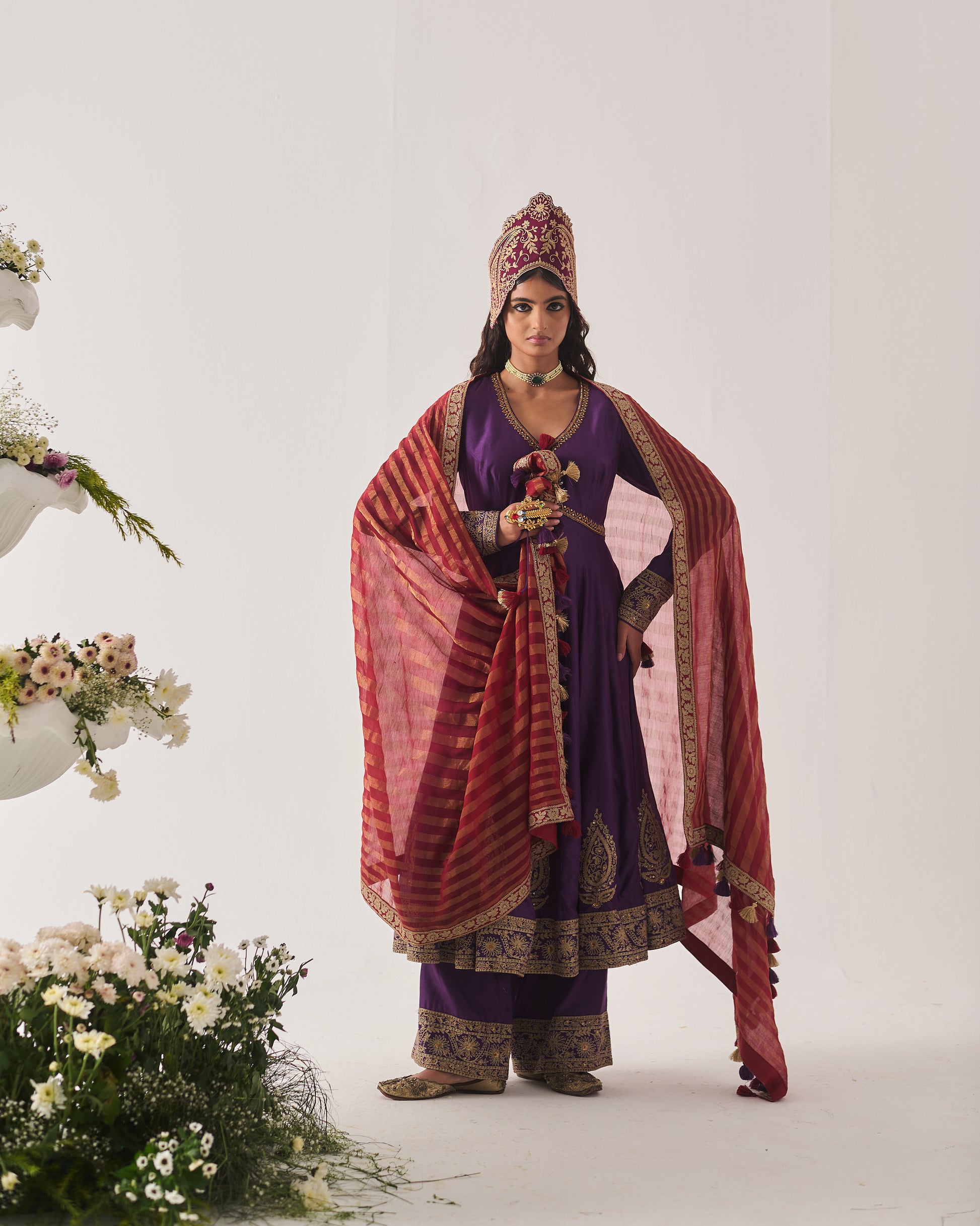Chanderi Handloom Anarkali paired with Flare Pants and Dupatta with woven stripes. Featuring Intricate Zari Aari Embroidery with Hand Highlights of Sequin, Cut Dana, and Beads.