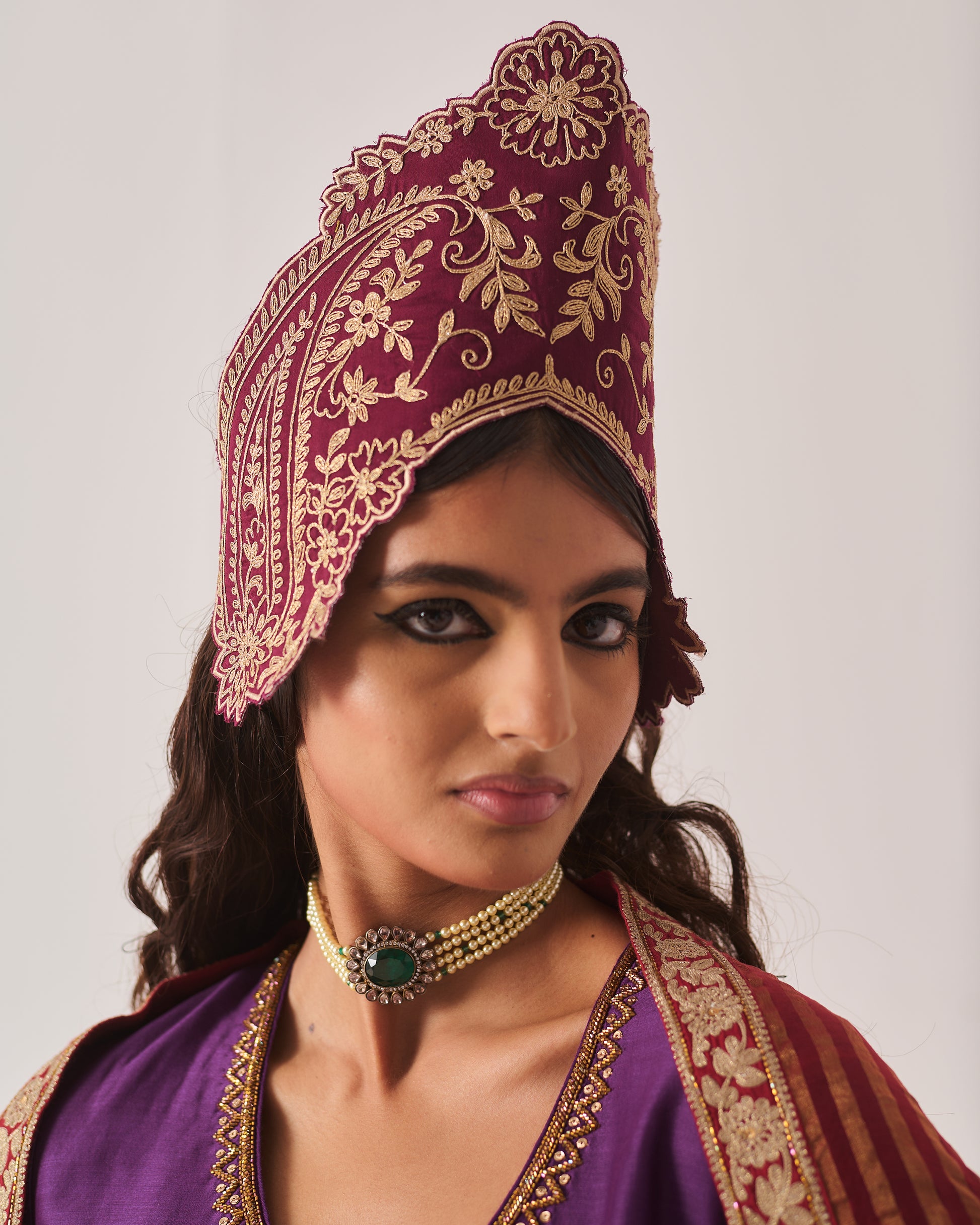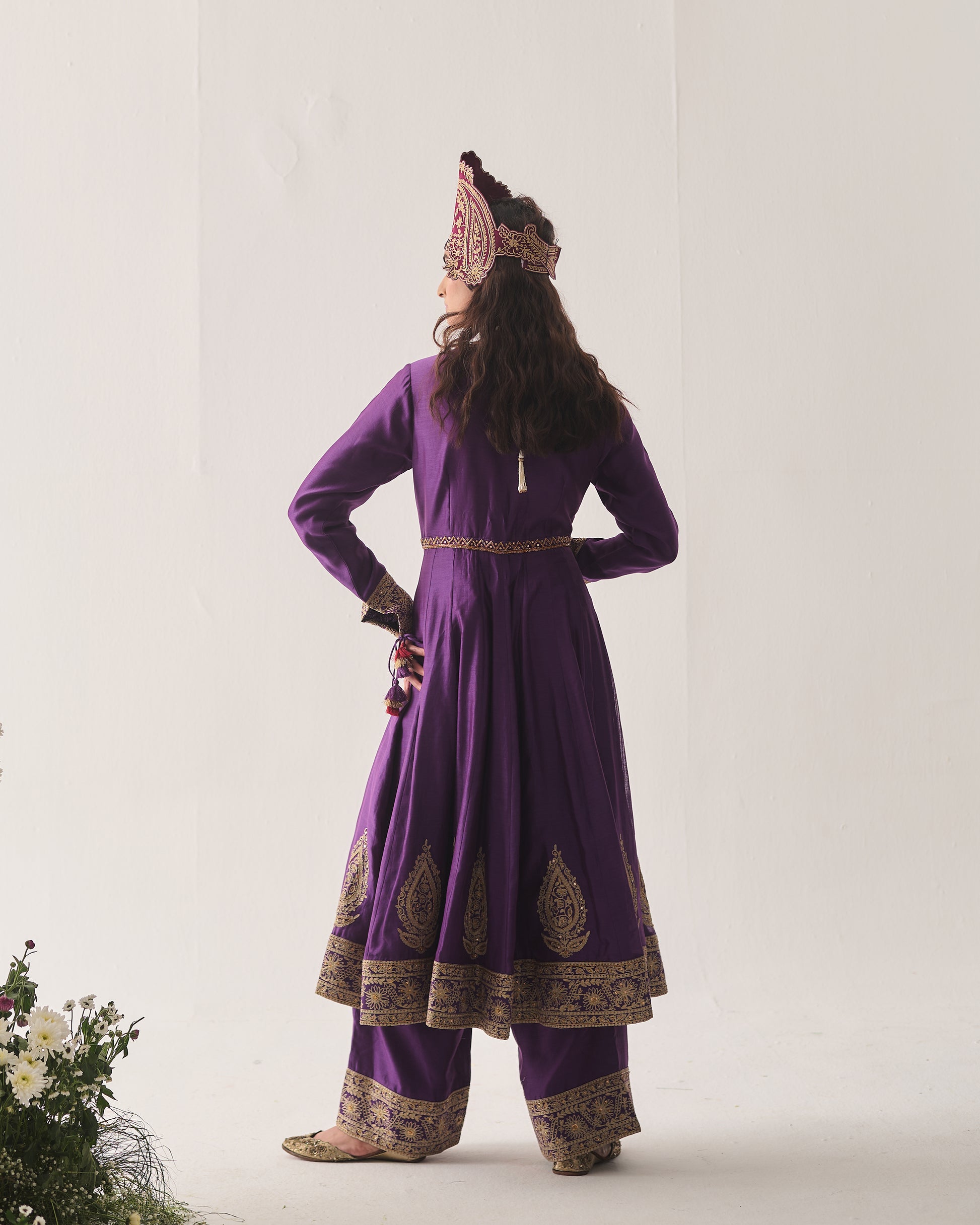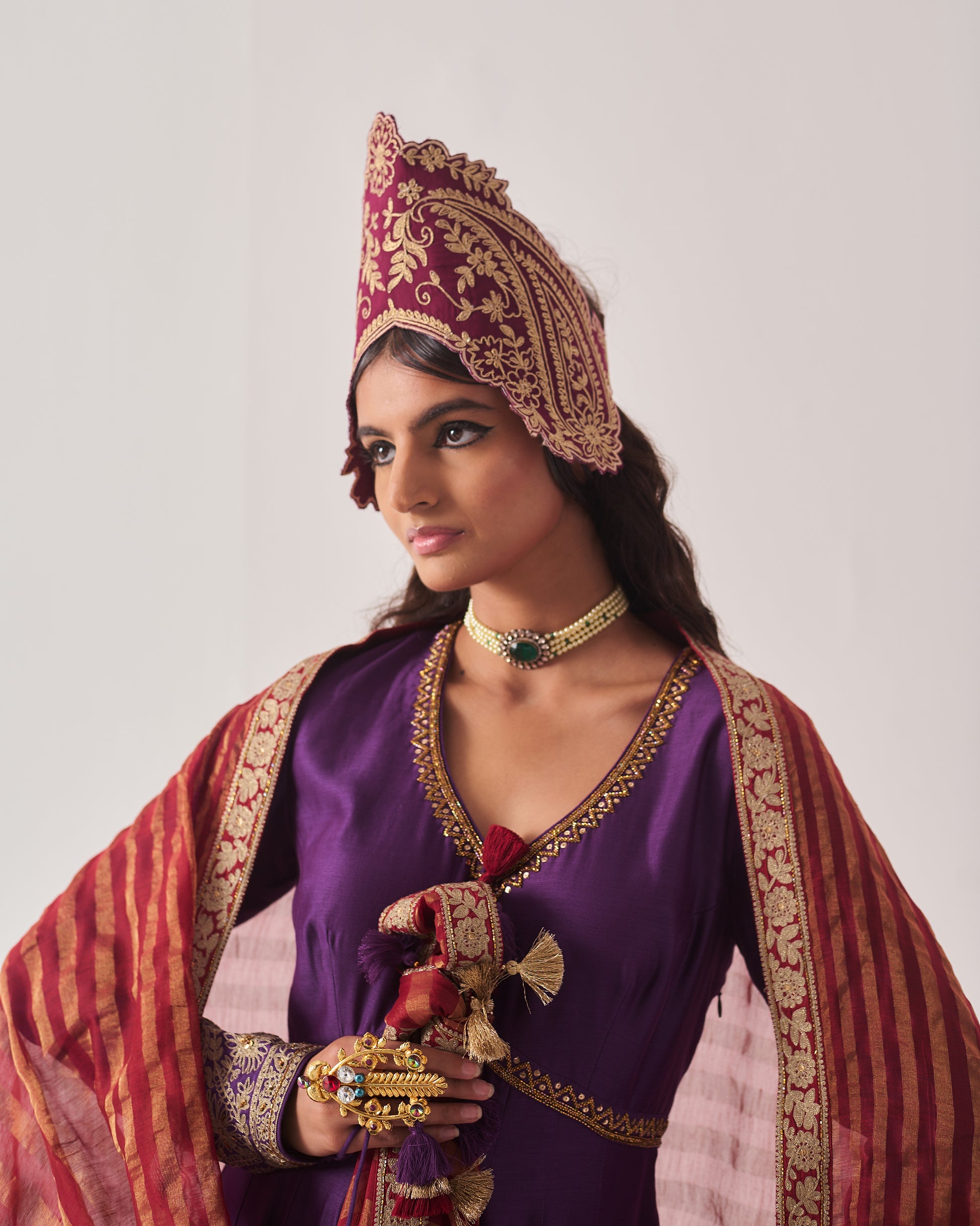 Chanderi Handloom Anarkali paired with Flare Pants and Dupatta with woven stripes. Featuring Intricate Zari Aari Embroidery with Hand Highlights of Sequin, Cut Dana, and Beads.
