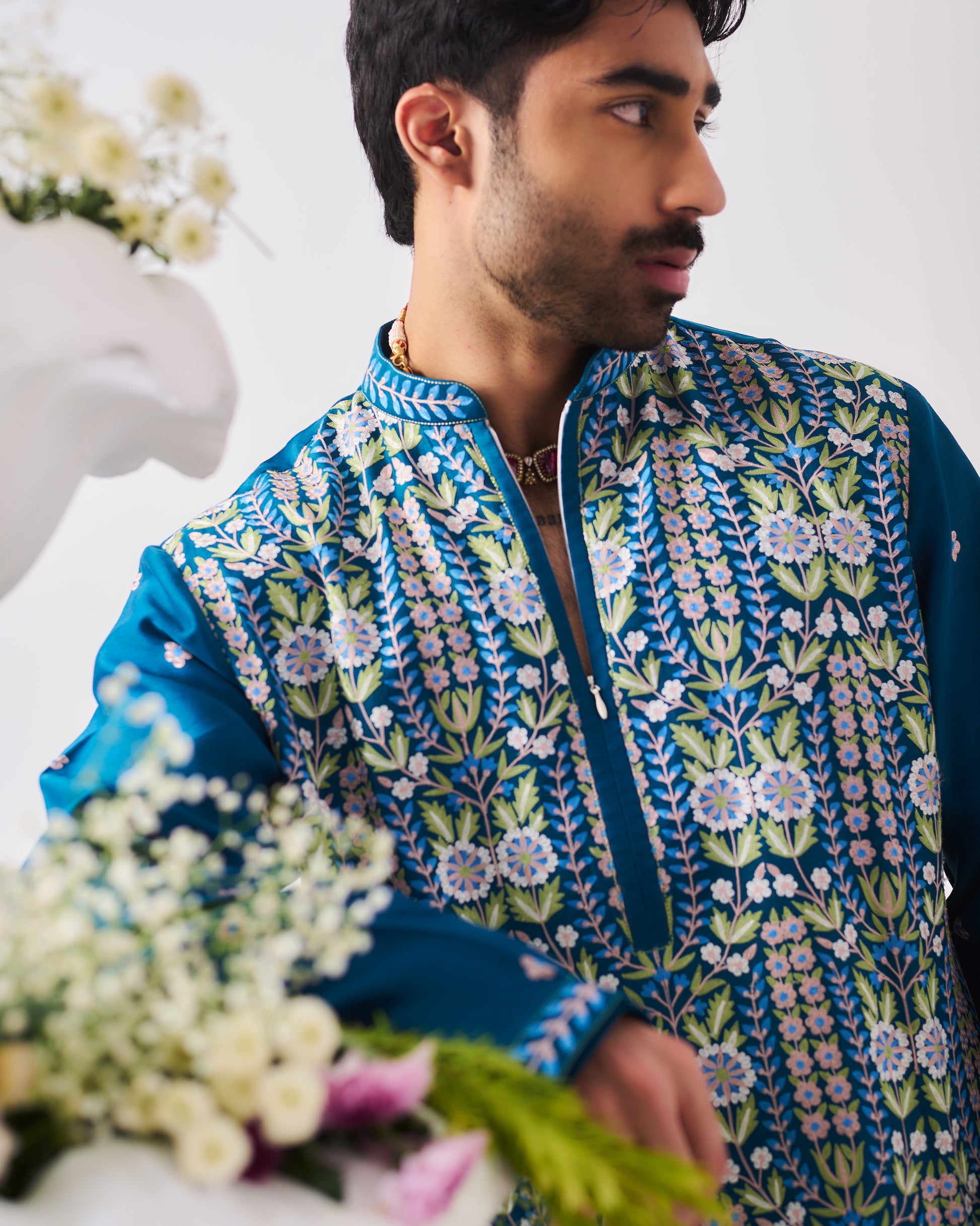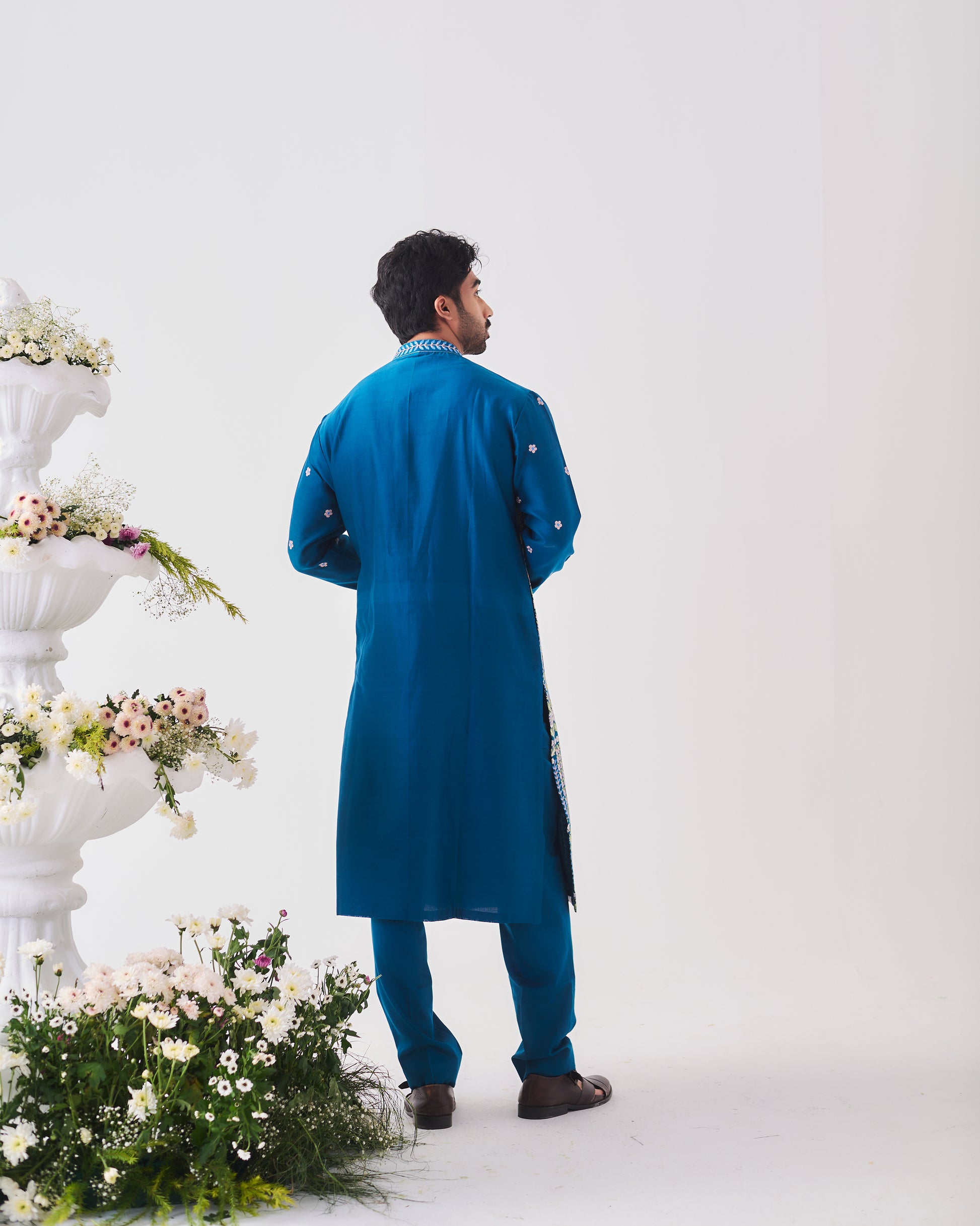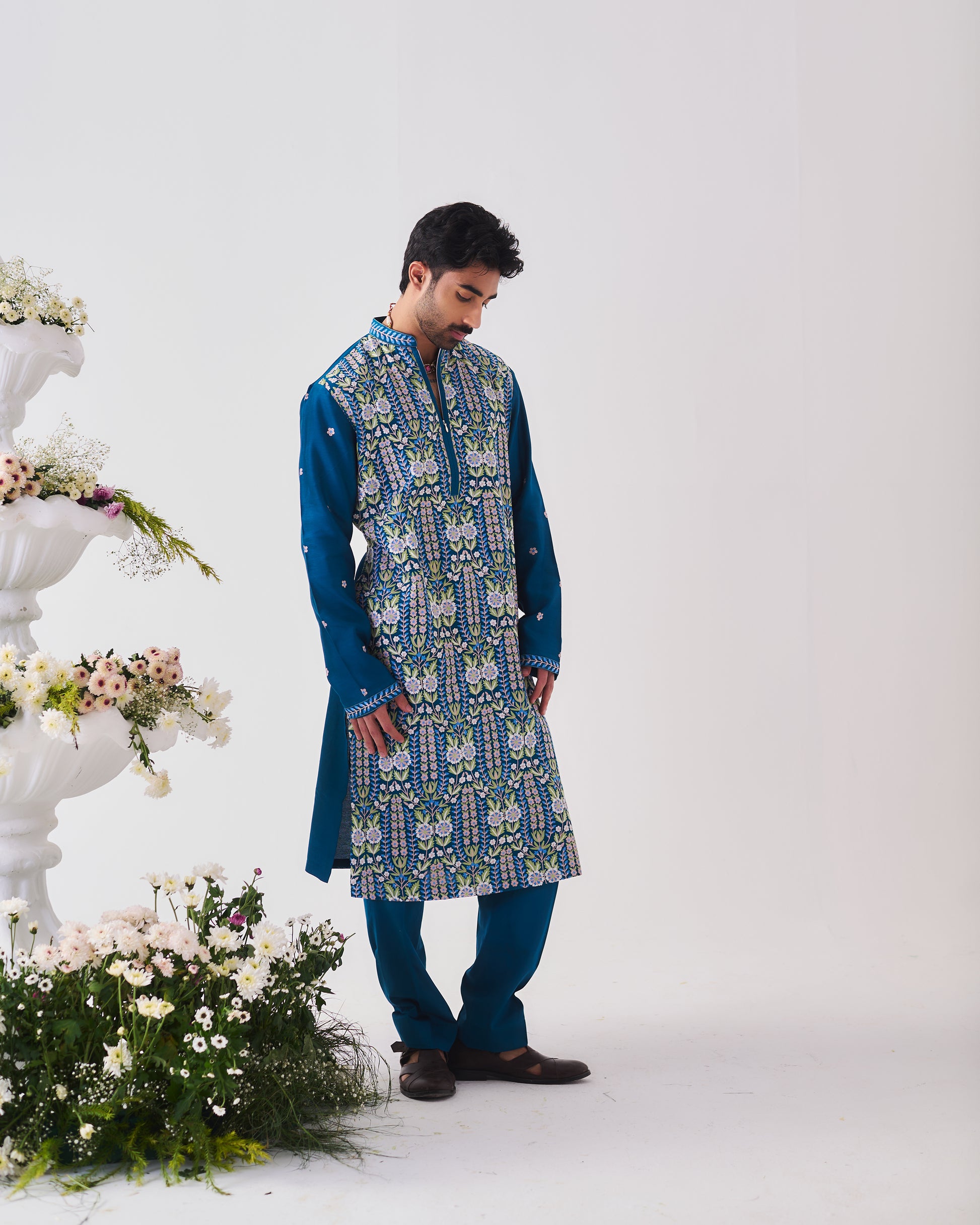 Chanderi Handloom Kurta paired with Pyjama Pants. Featuring Intricate Multicolour Aari Embroidery.
