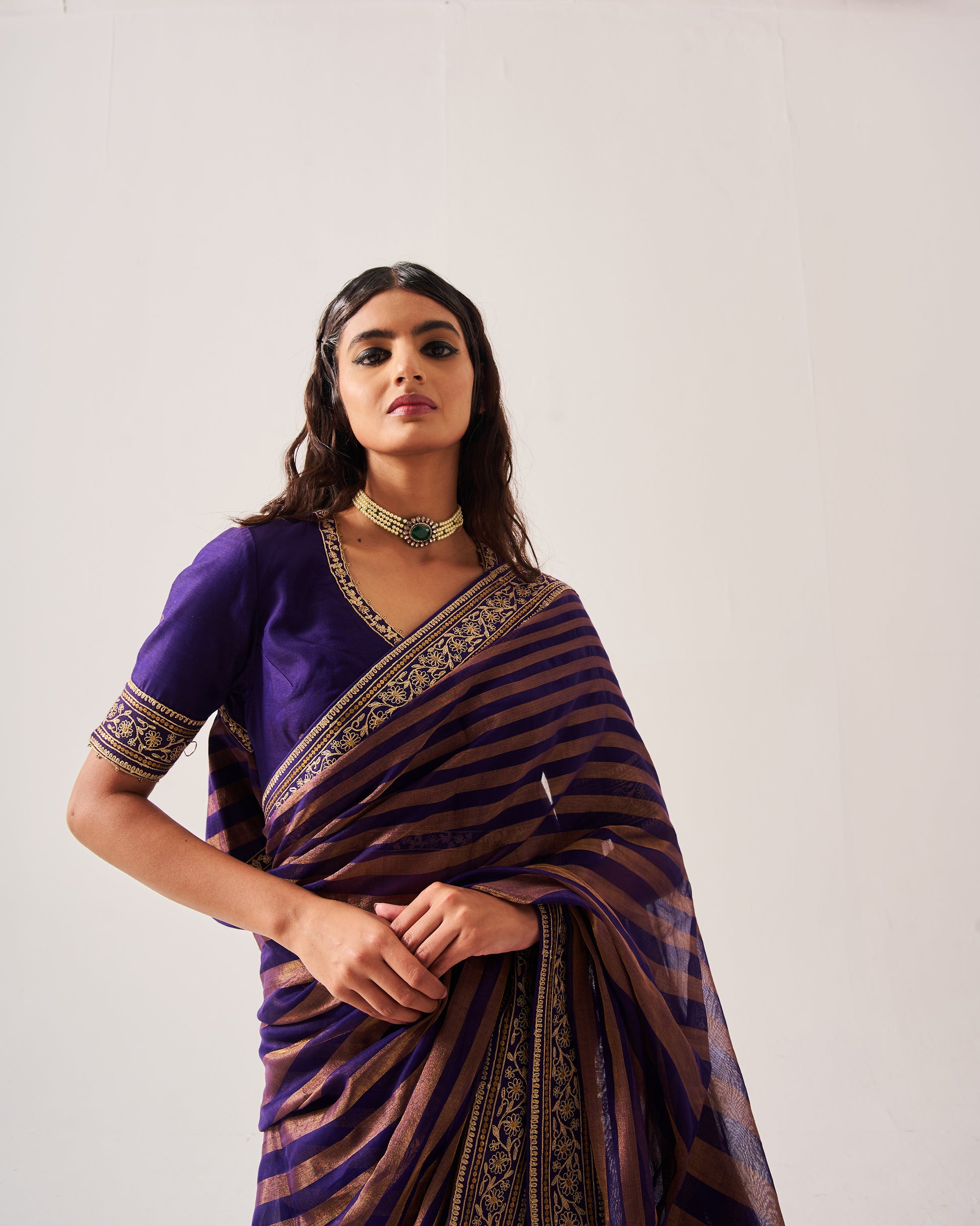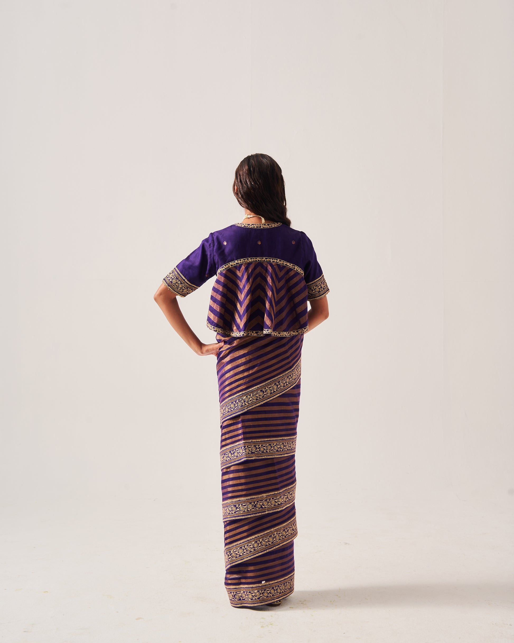 Chanderi Handloom Saree with woven Stripes paired with Stitched Peplum Blouse. Featuring Intricate Zari Dori and Marodi Embroidery with Hand Highlights of Sequin.