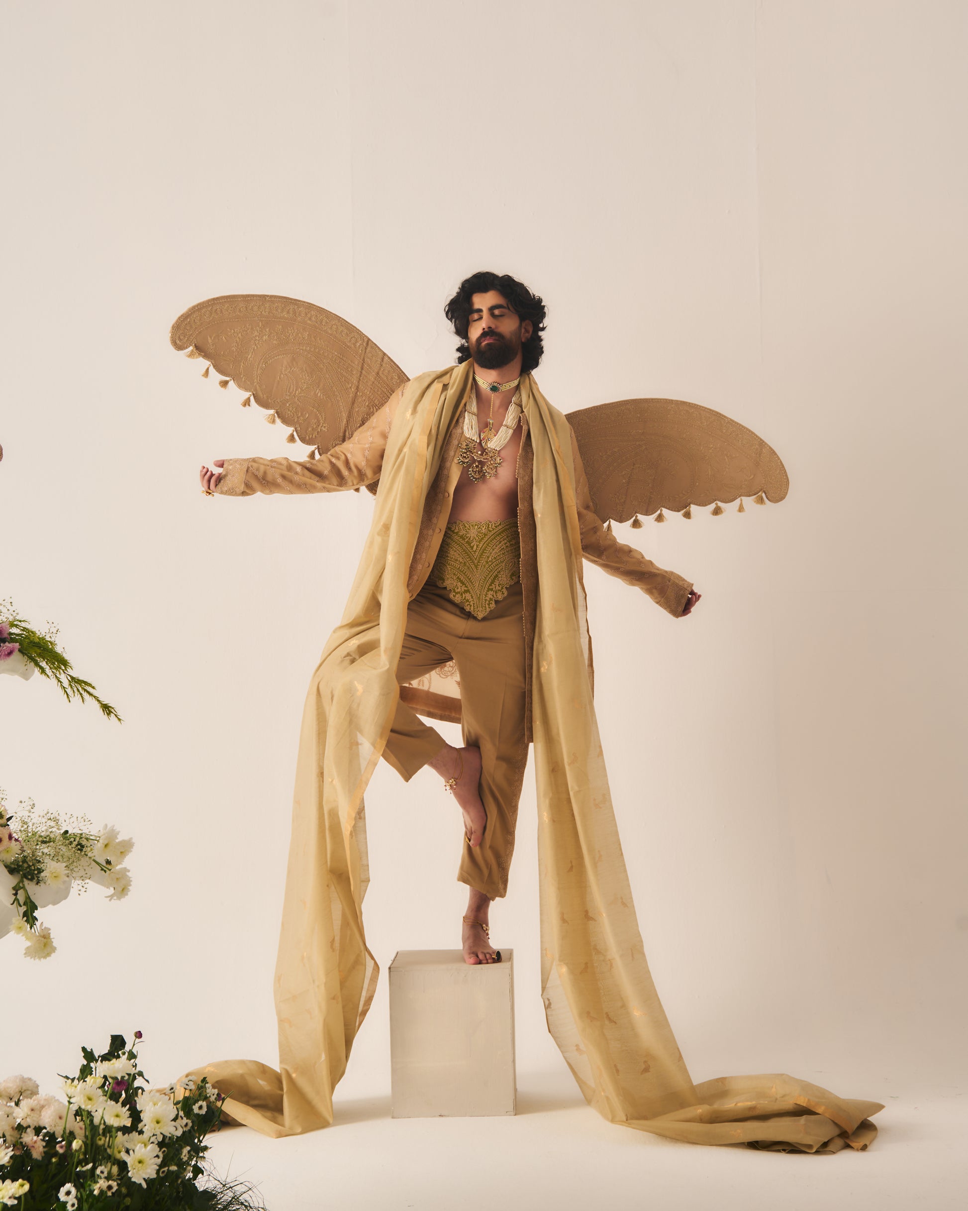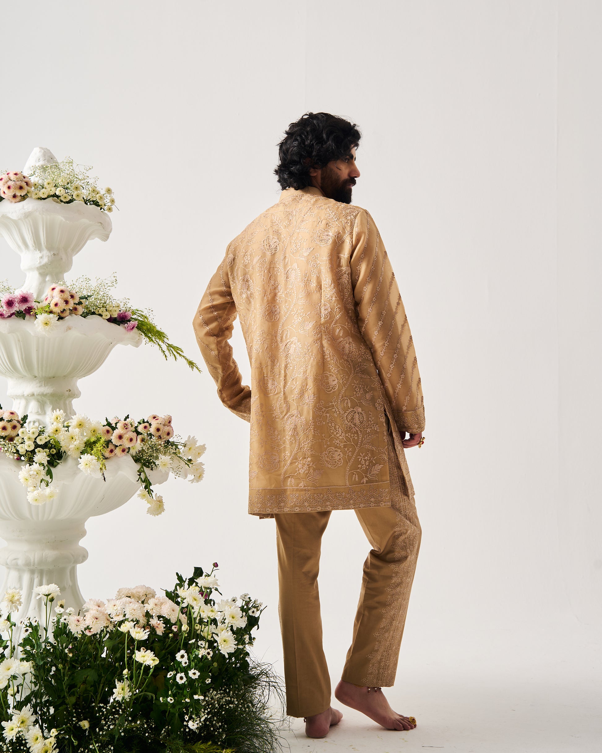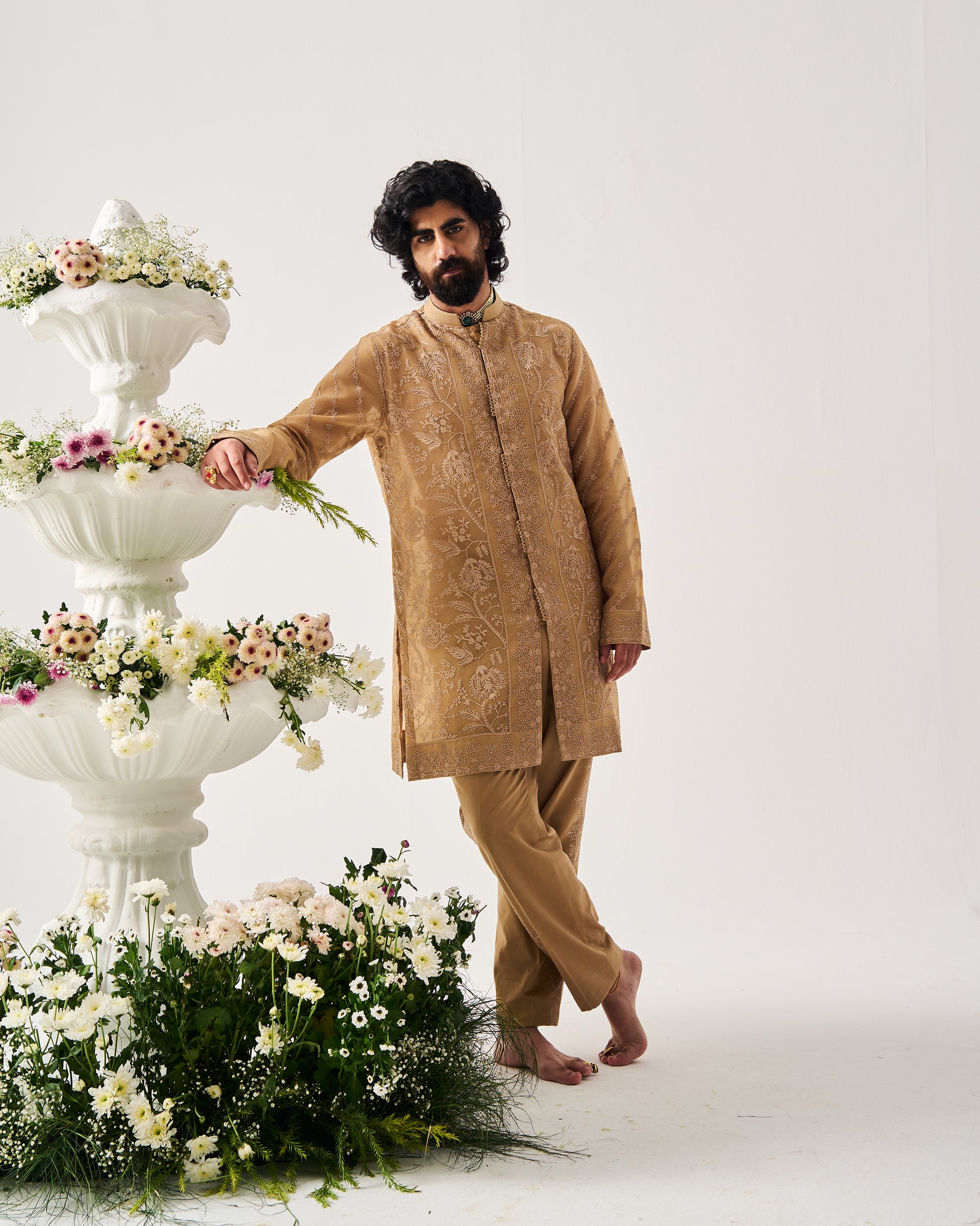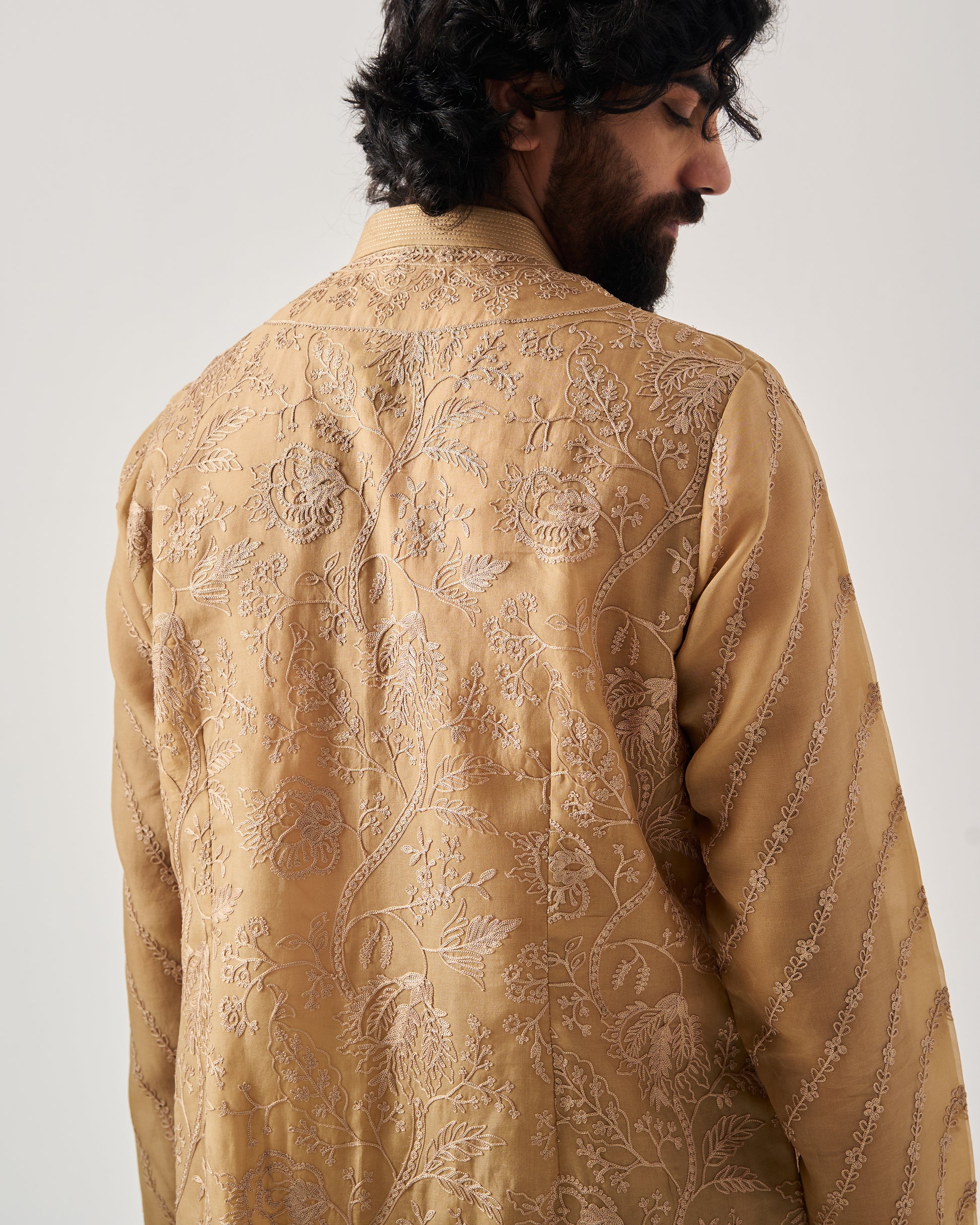 Organza Silk Front Open Kurta paired with Pants. Featuring Intricate Aari Embroidery.