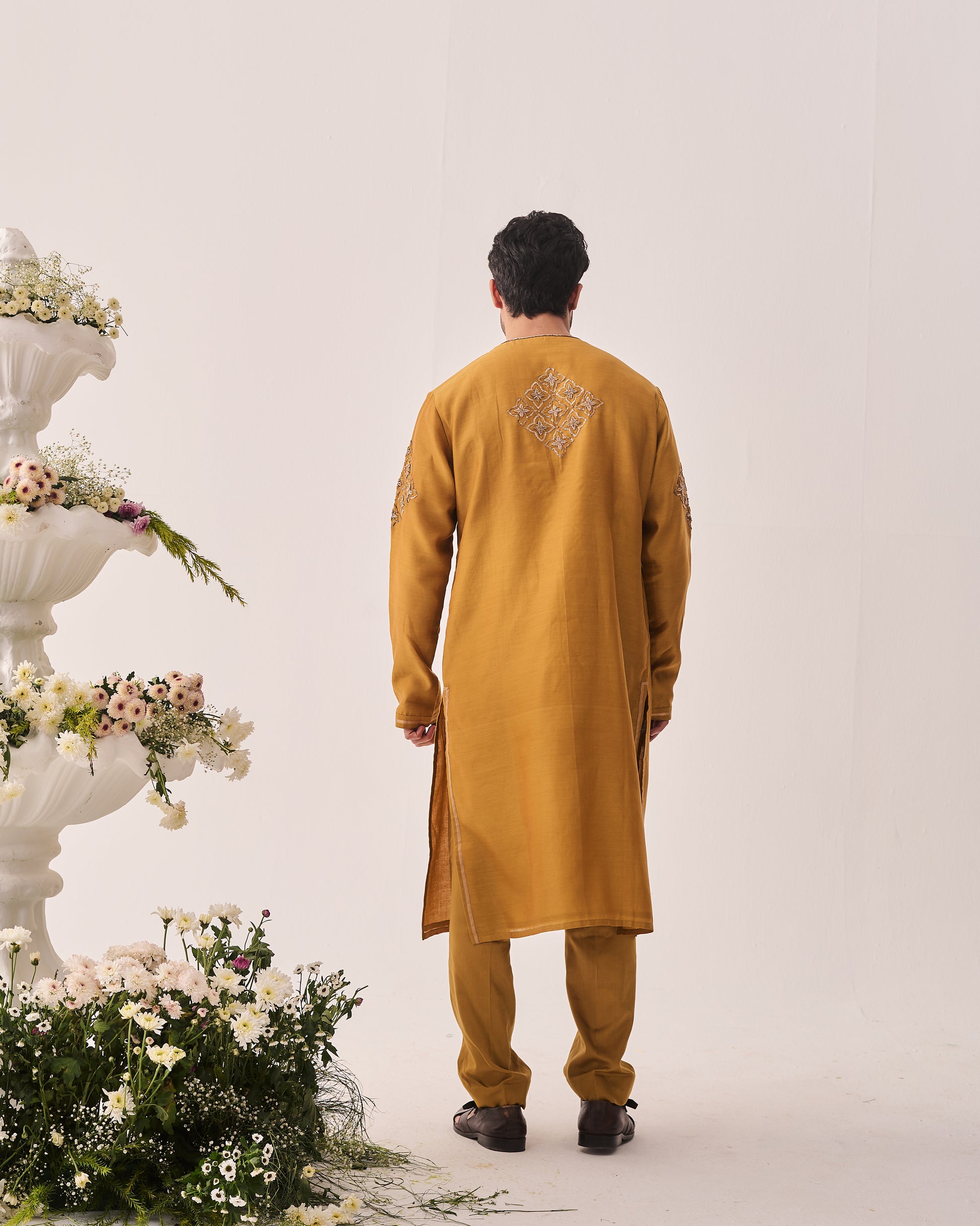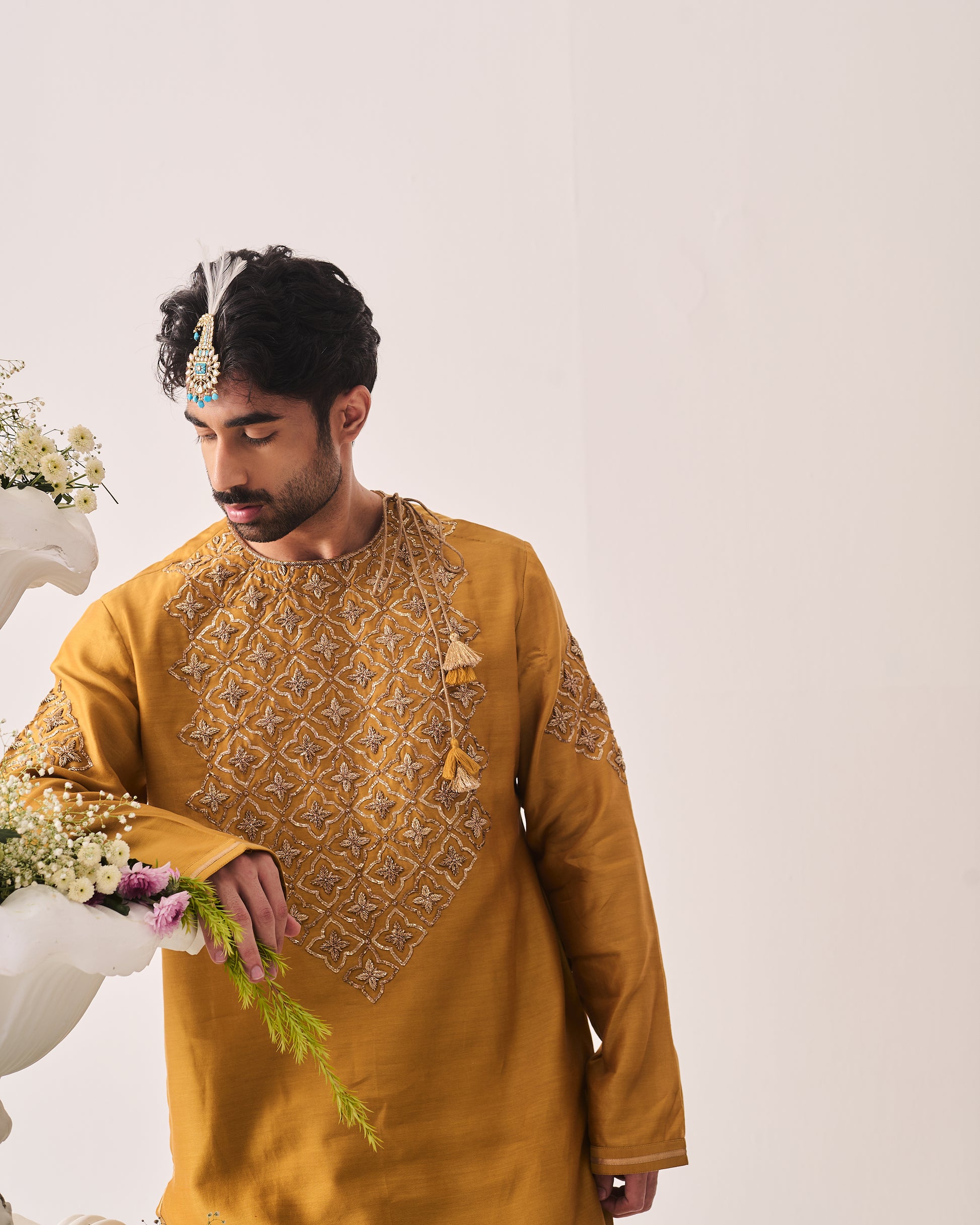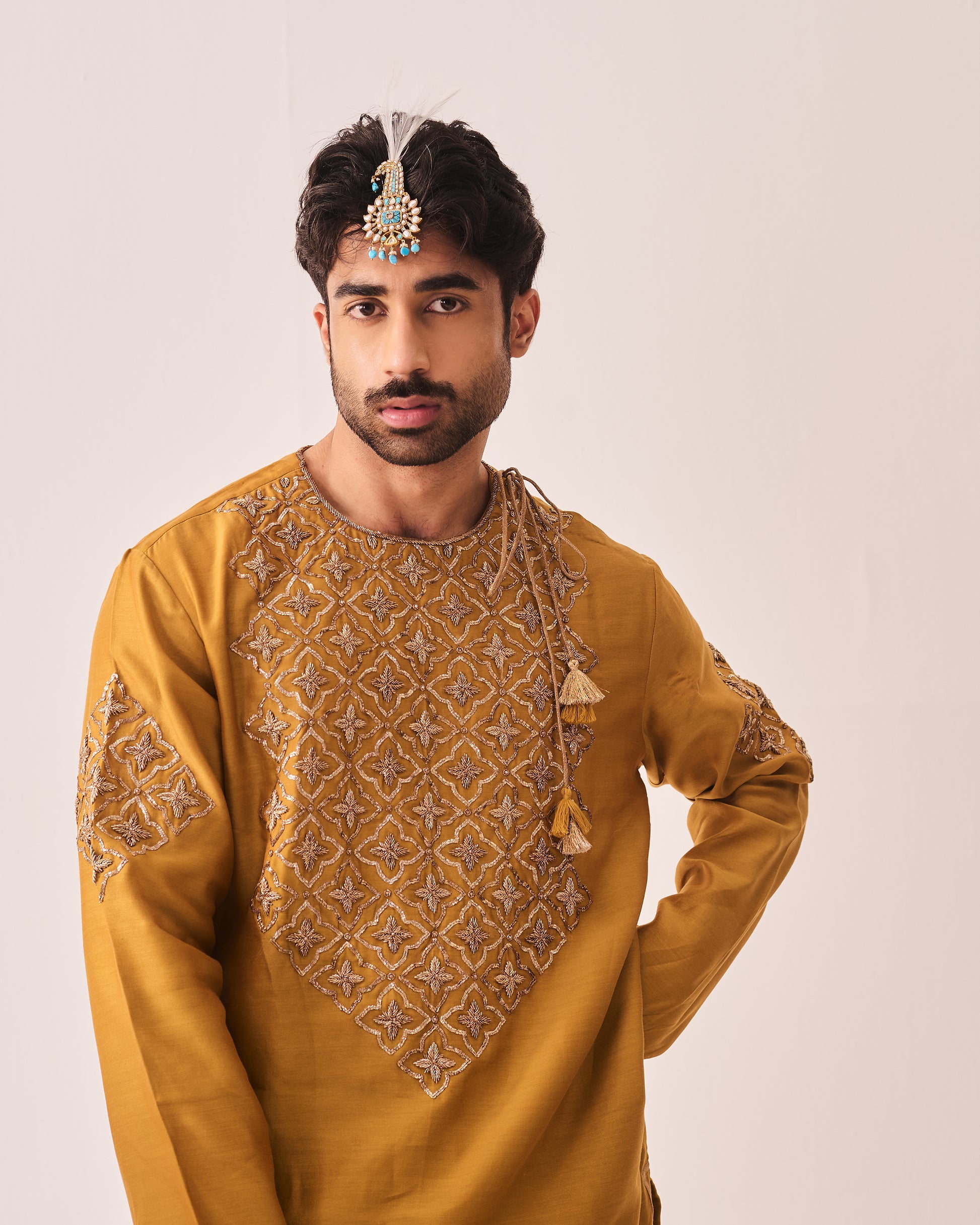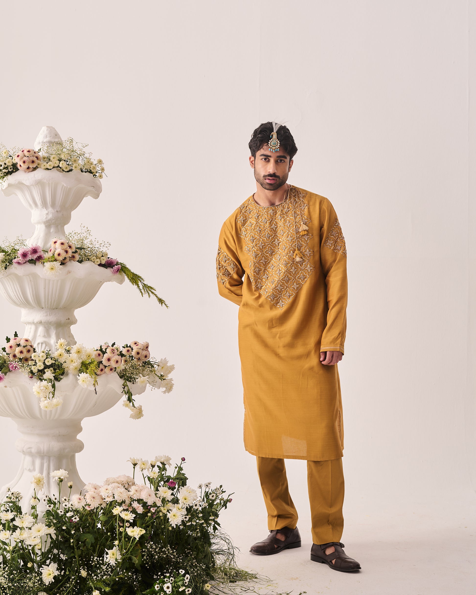 Chanderi Handloom Kurta paired with Pyjama Pants. Featuring real Hand Embroidery with Nakshi and Pitta Work.